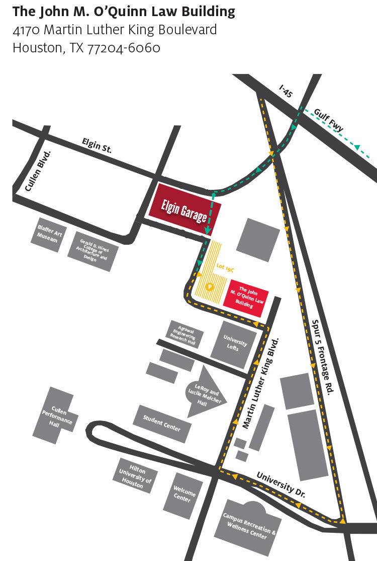 To reach the Law Center from I-45 southbound, take the Spur 5 exit and follow it to the first stop light (University Drive). Turn right, and proceed past the Campus Wellness Center to the stop light. Turn right, and proceed past University Lofts to the last entrance on your left before the street “dead ends.” Make a left and the Law Center will be seen on your right. Parking is available in the Parking Garage 5 (Elgin Street Garage).