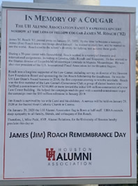 A proclamation in remembrance of James M. Roach '82 outside the University of Houston's Athletics/Alumni Center.