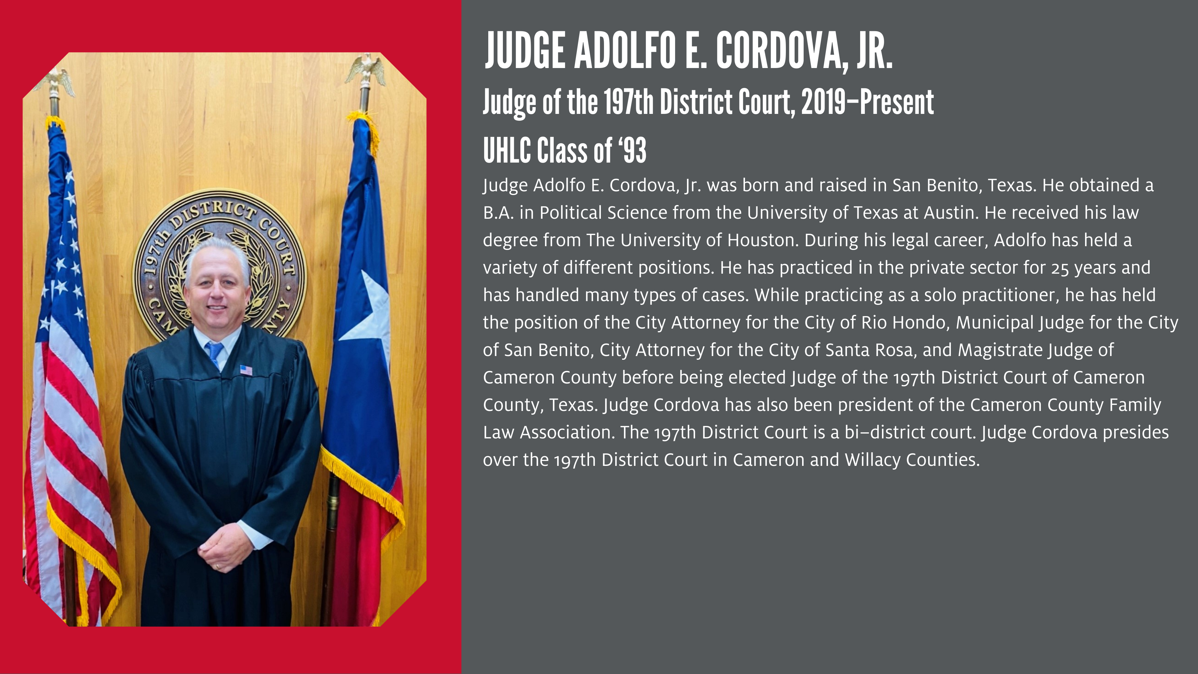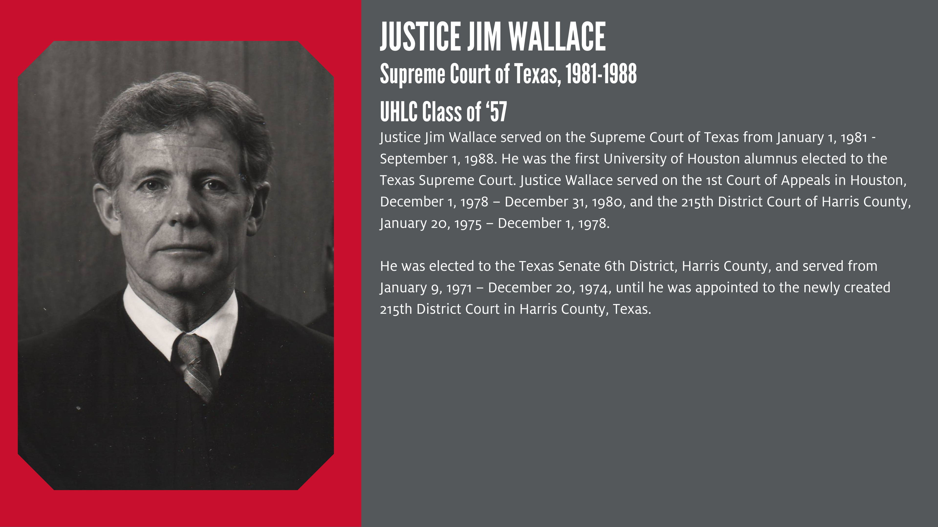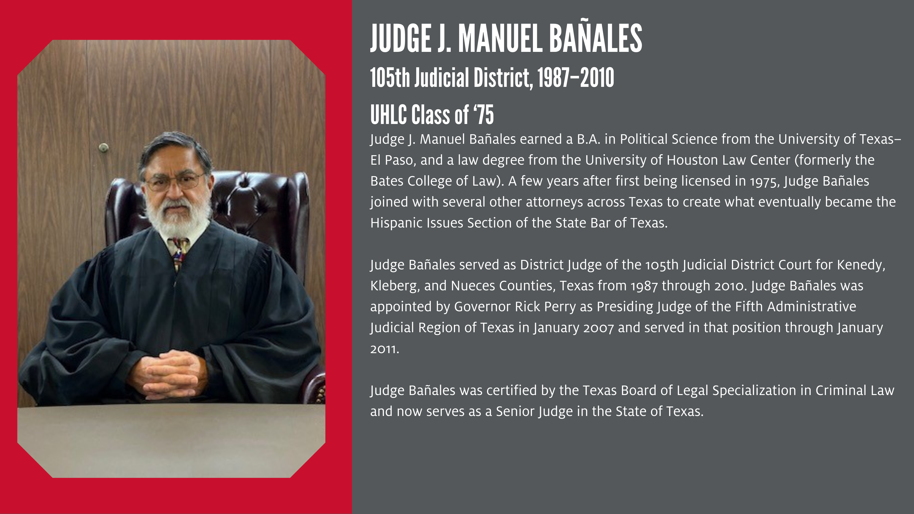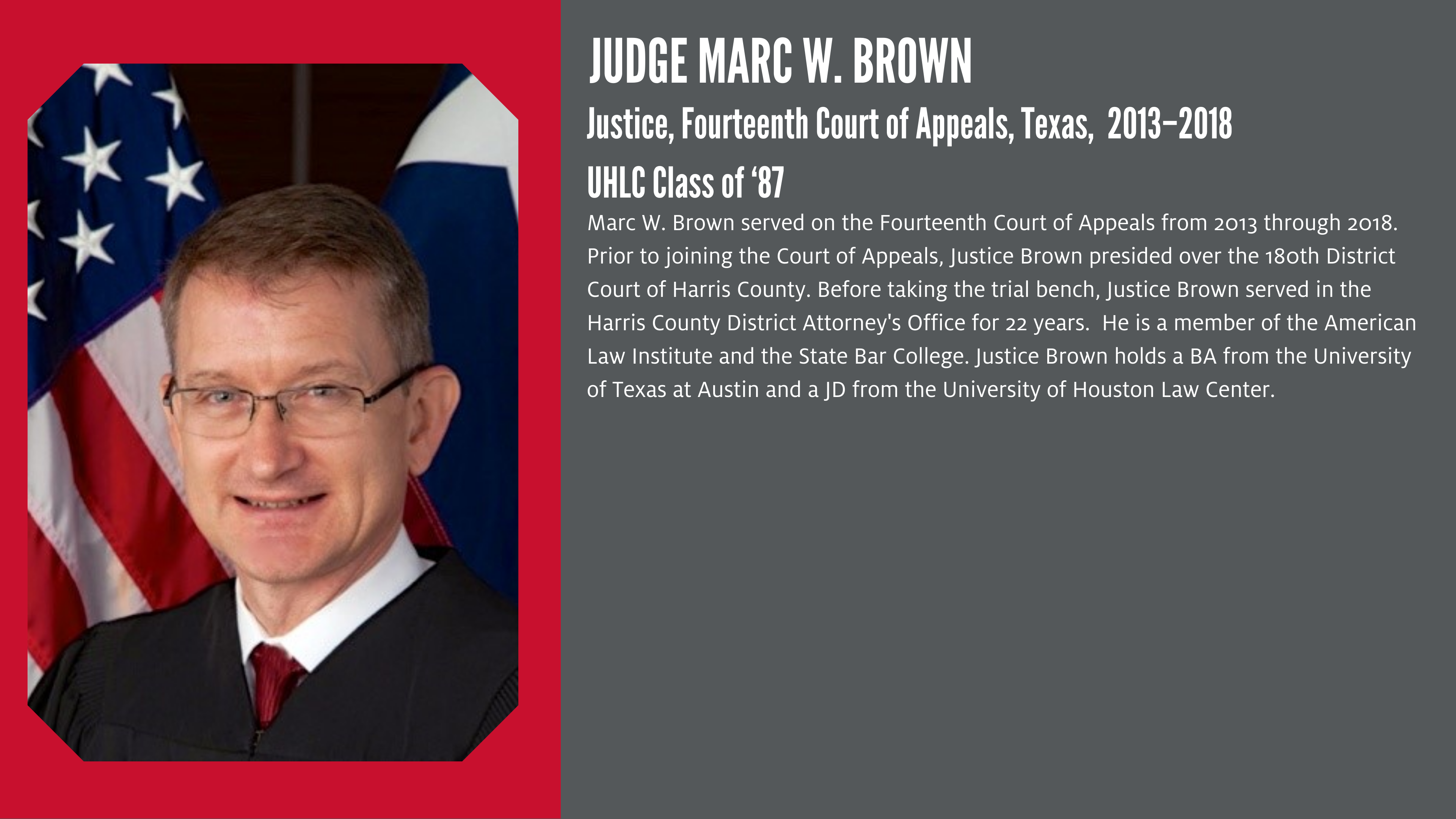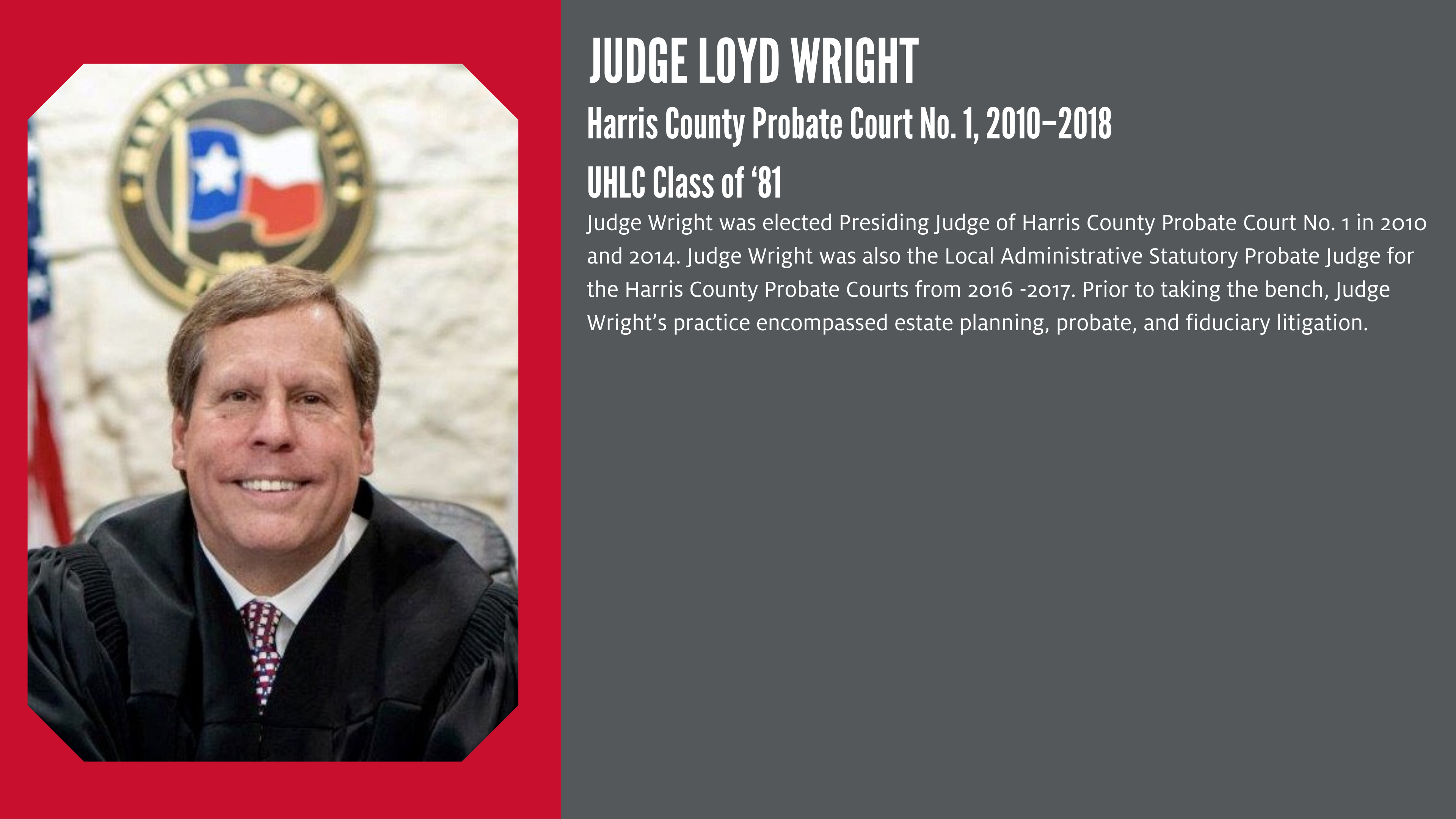 The recognition of the members of the judiciary is an ongoing project made possible by your submissions. To be included on the digital judicial wall and this site, please CLICK HERE. For questions, to update an existing slide, or to add someone you know, please contact Kristina Van Arsdel at kgvanars@central.uh.edu.