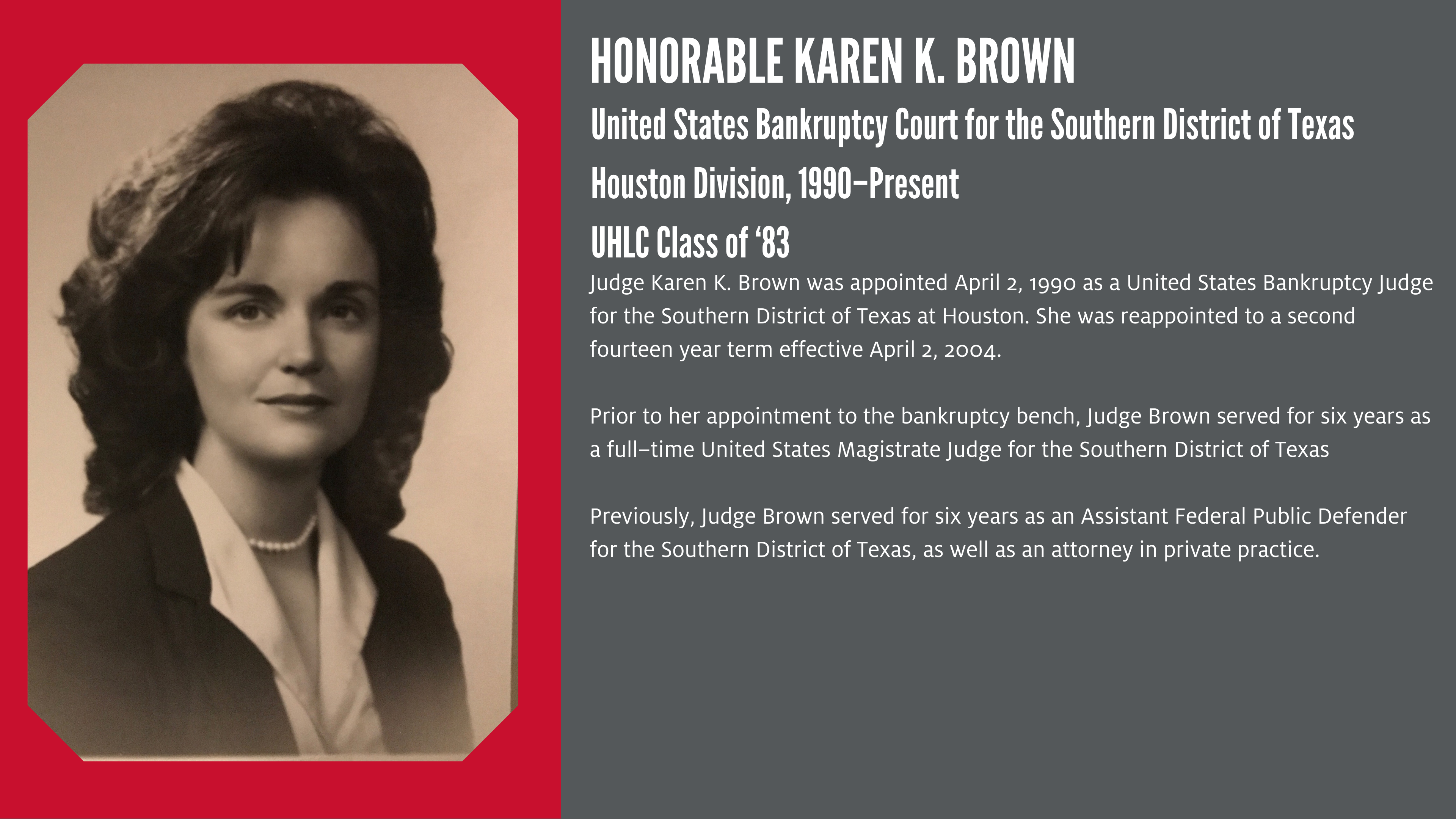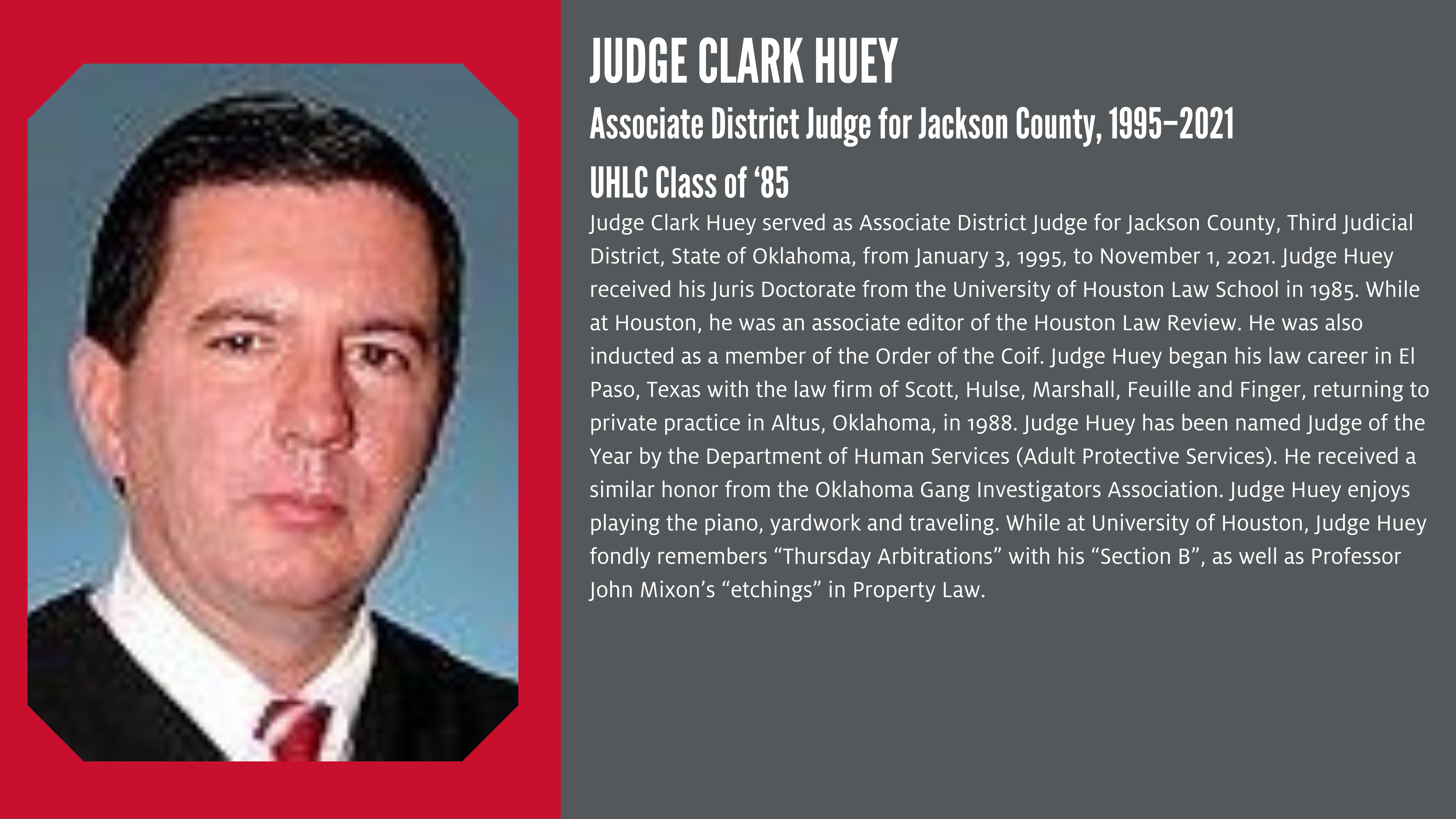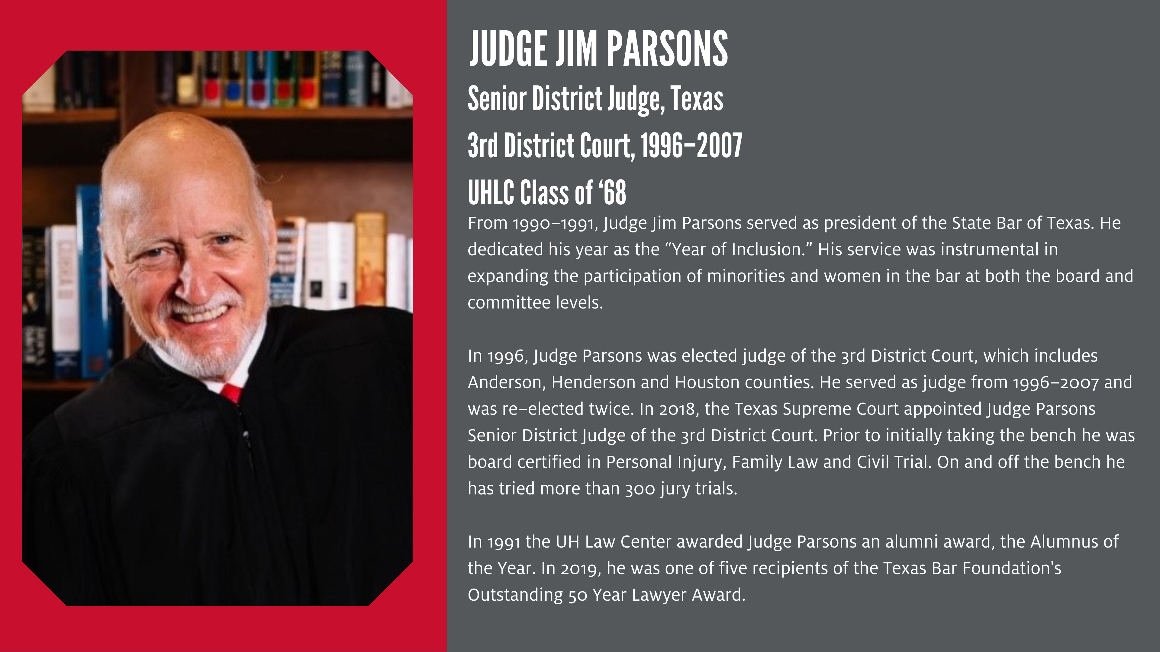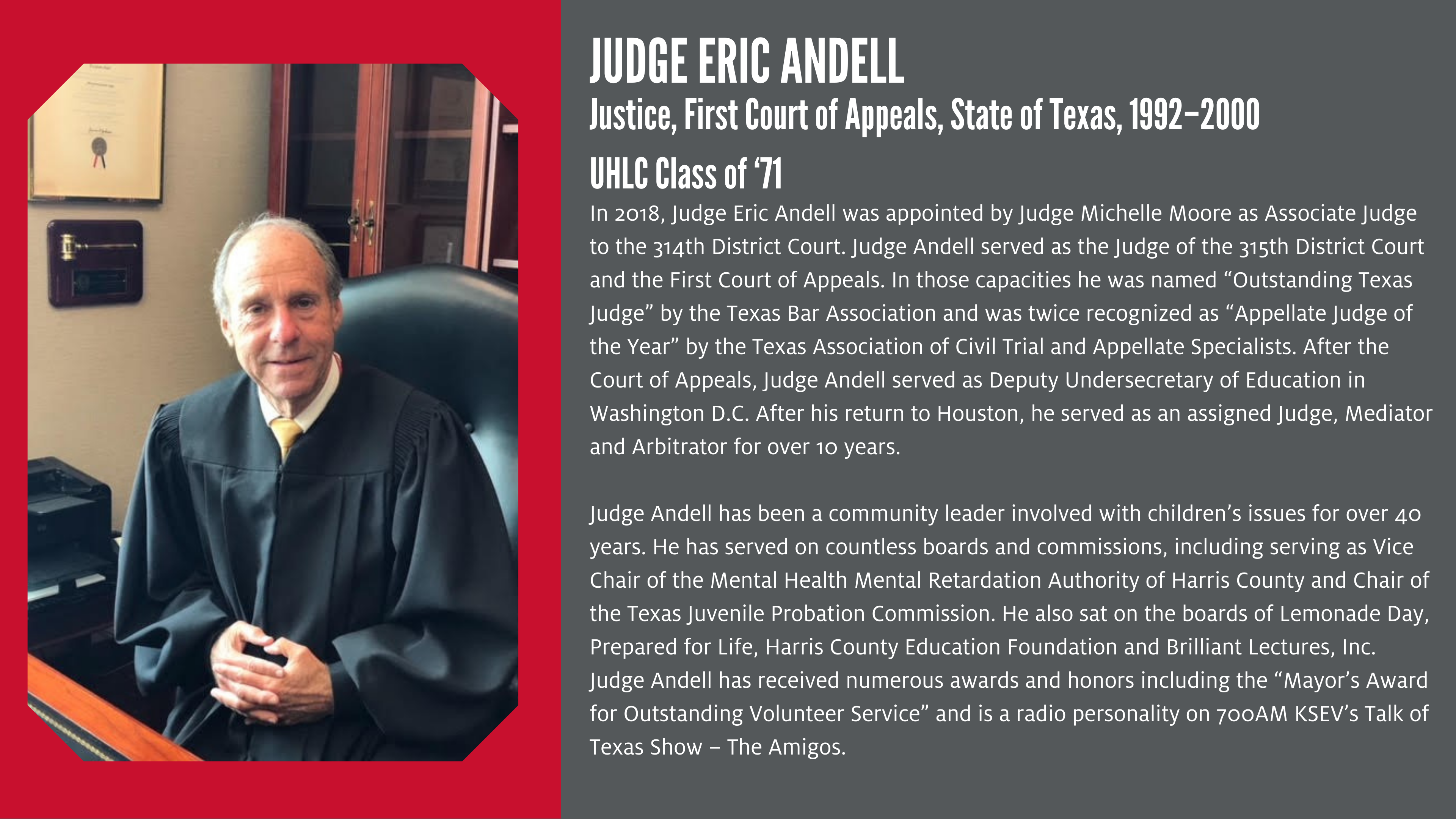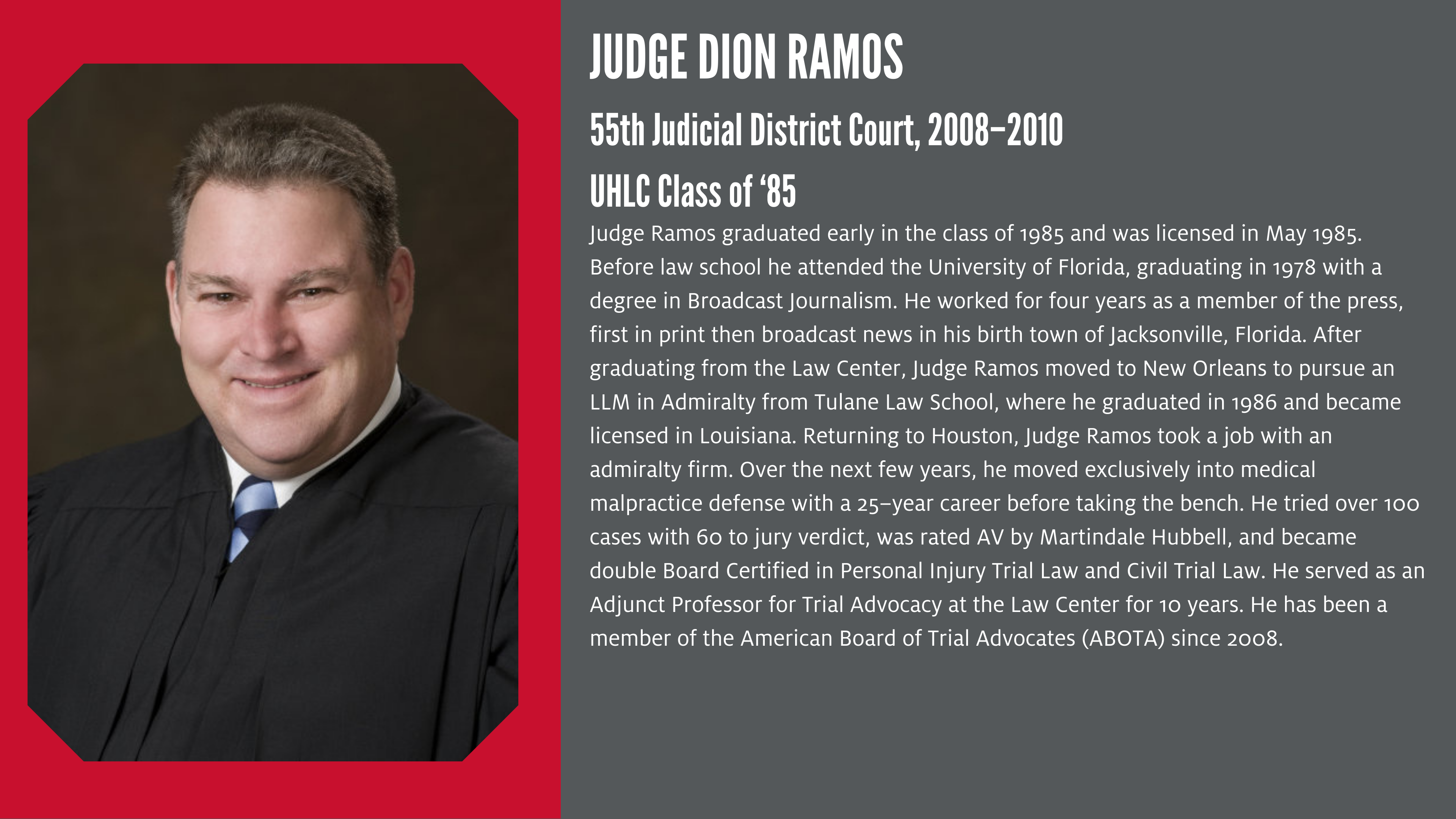 The recognition of the members of the judiciary is an ongoing project made possible by your submissions. To be included on the digital judicial wall and this site, please CLICK HERE. For questions, to update an existing slide, or to add someone you know, please contact Kristina Van Arsdel at kgvanars@central.uh.edu.