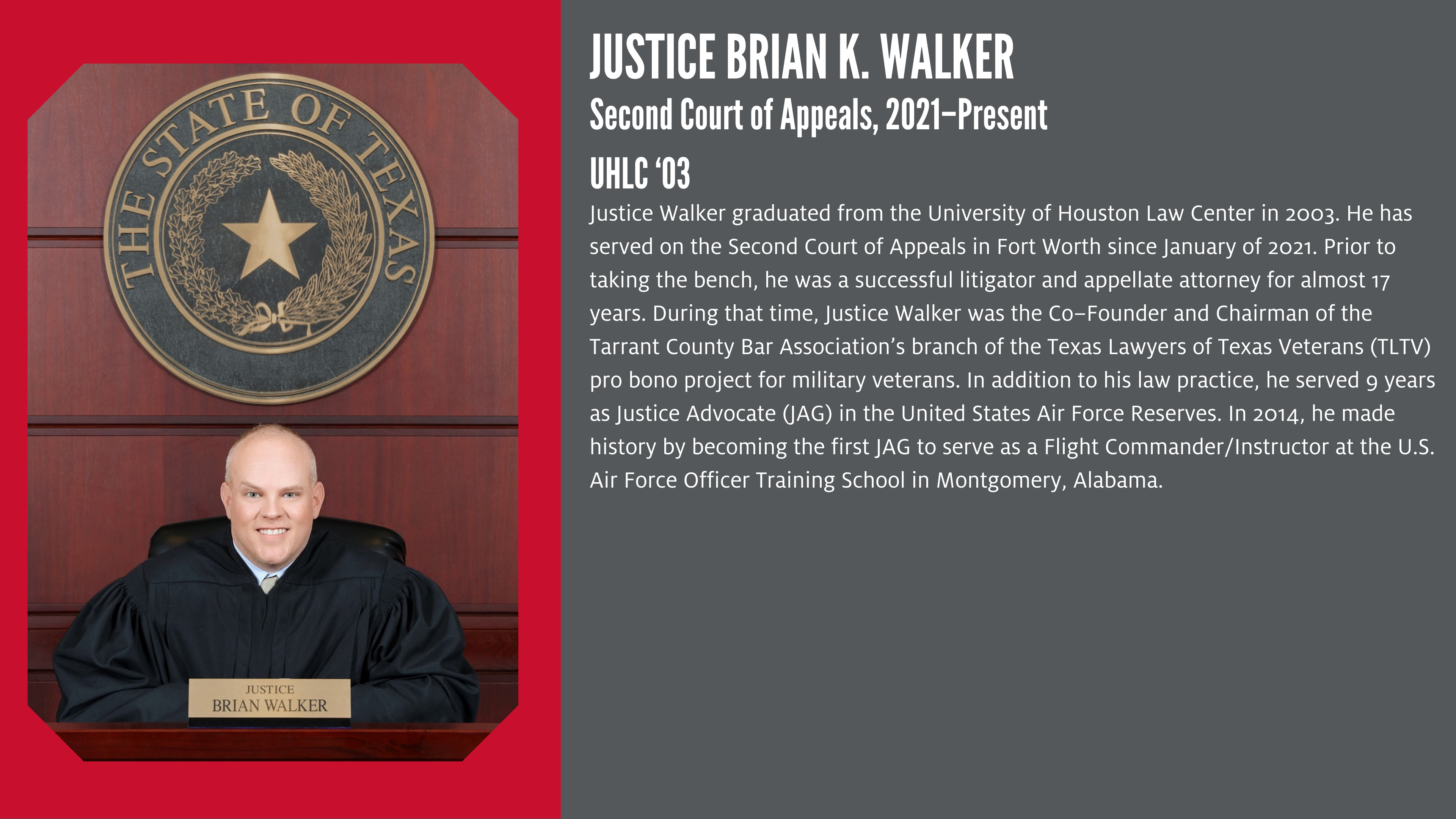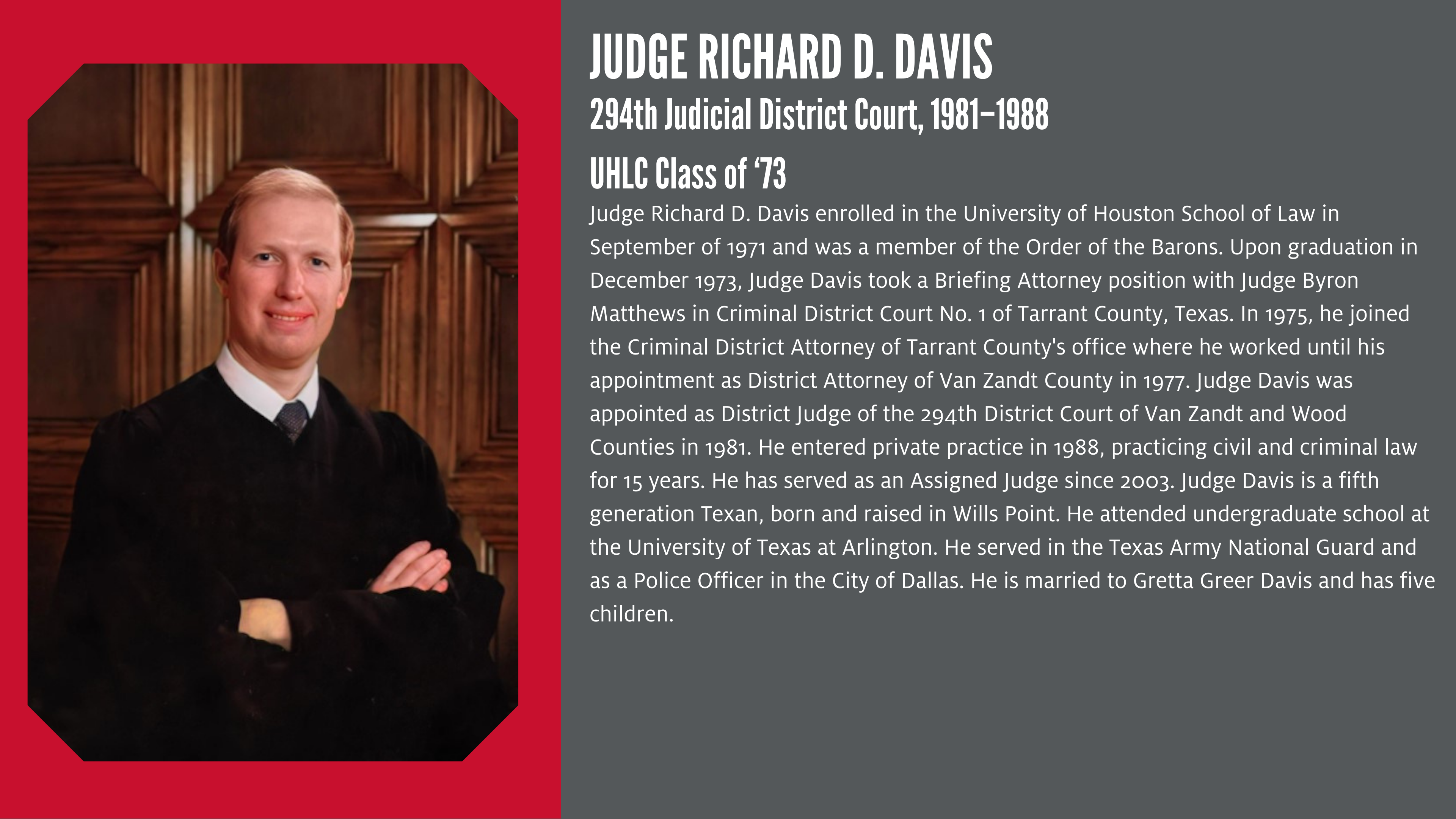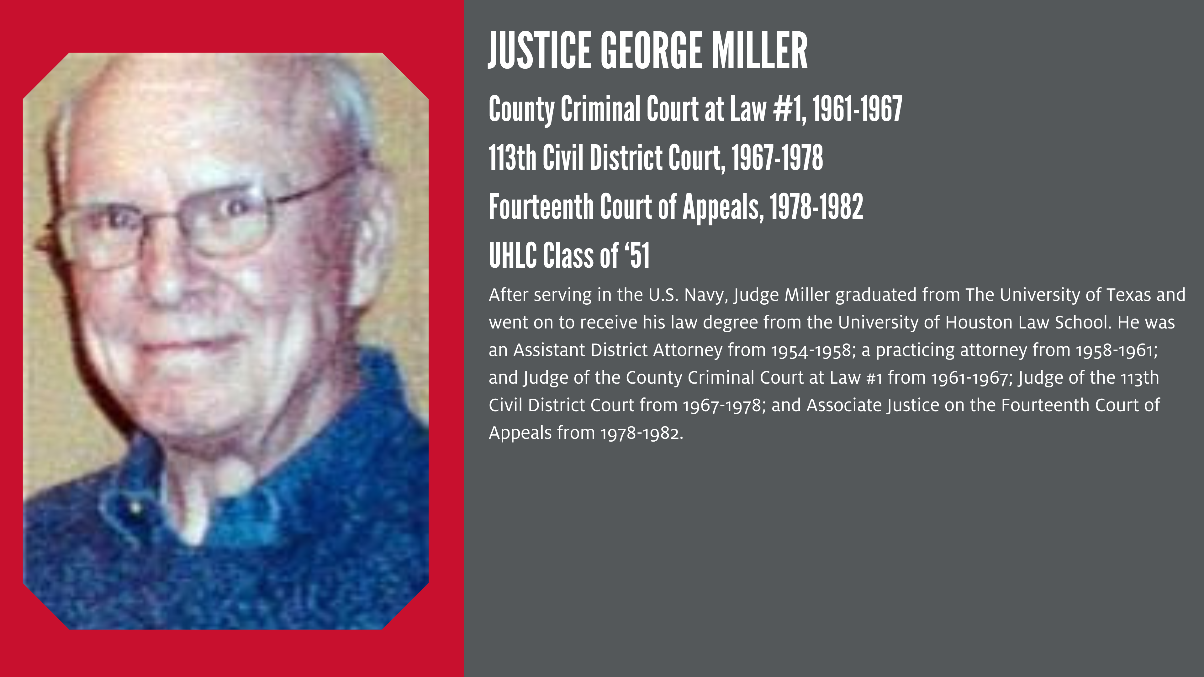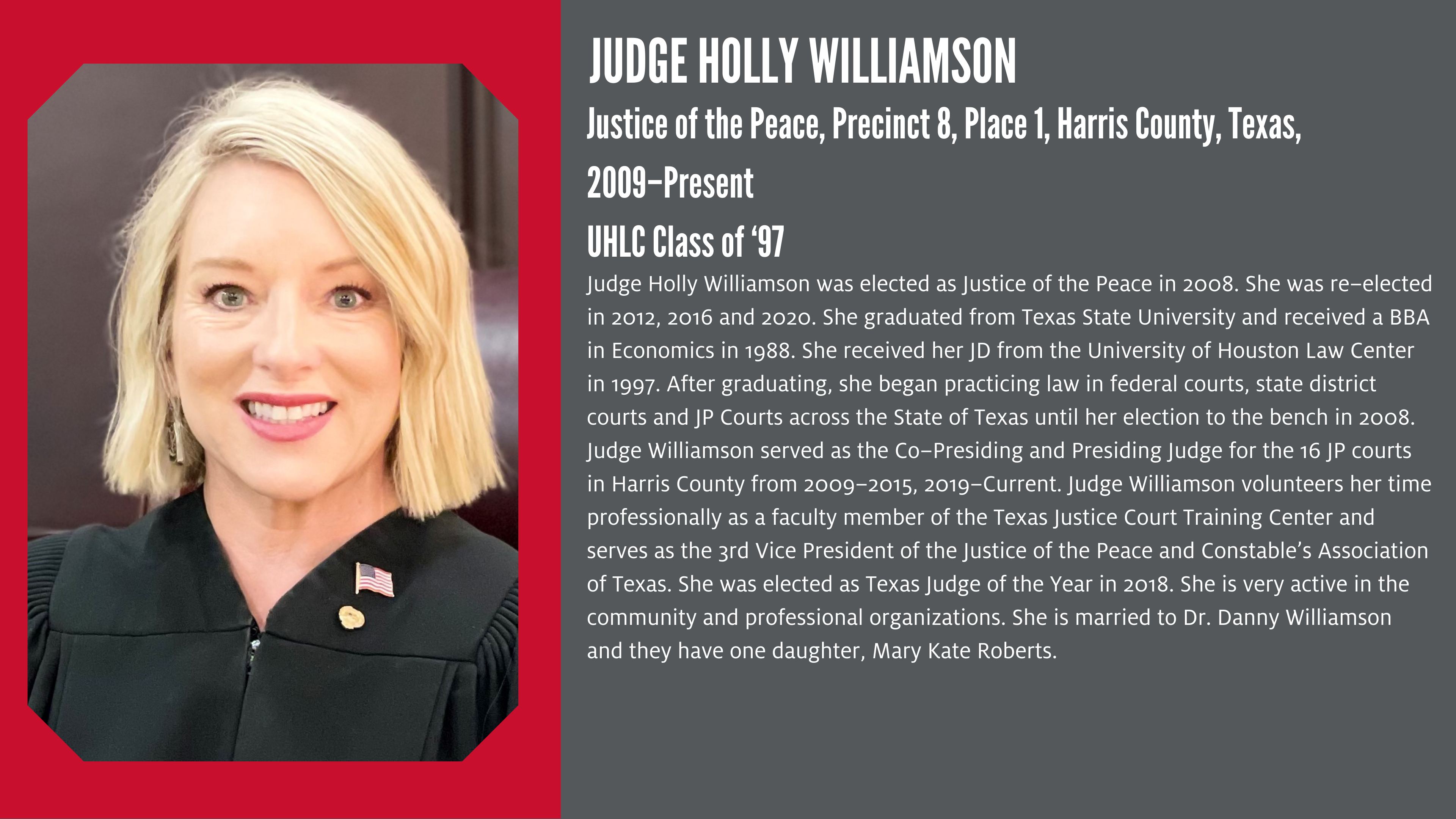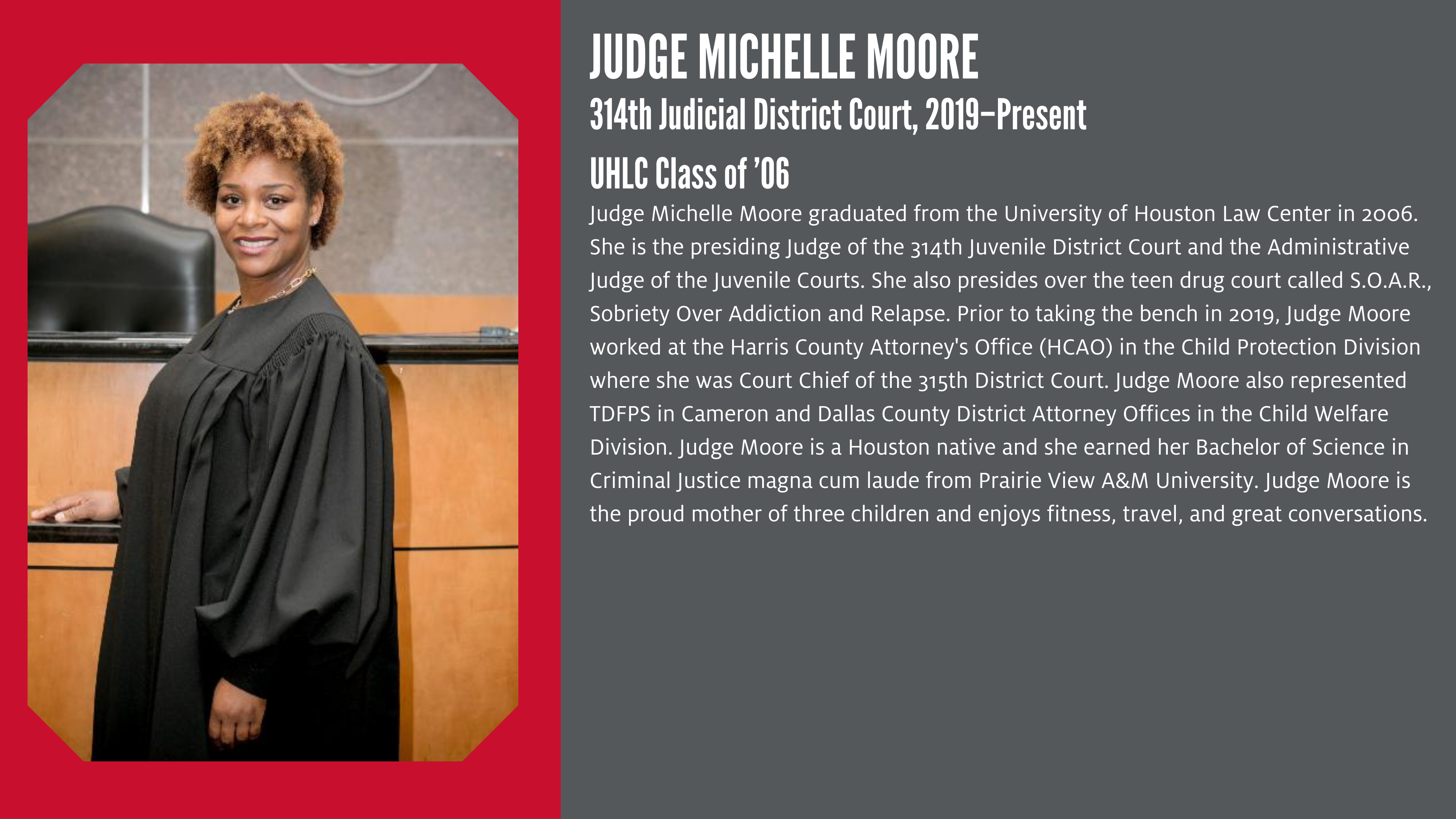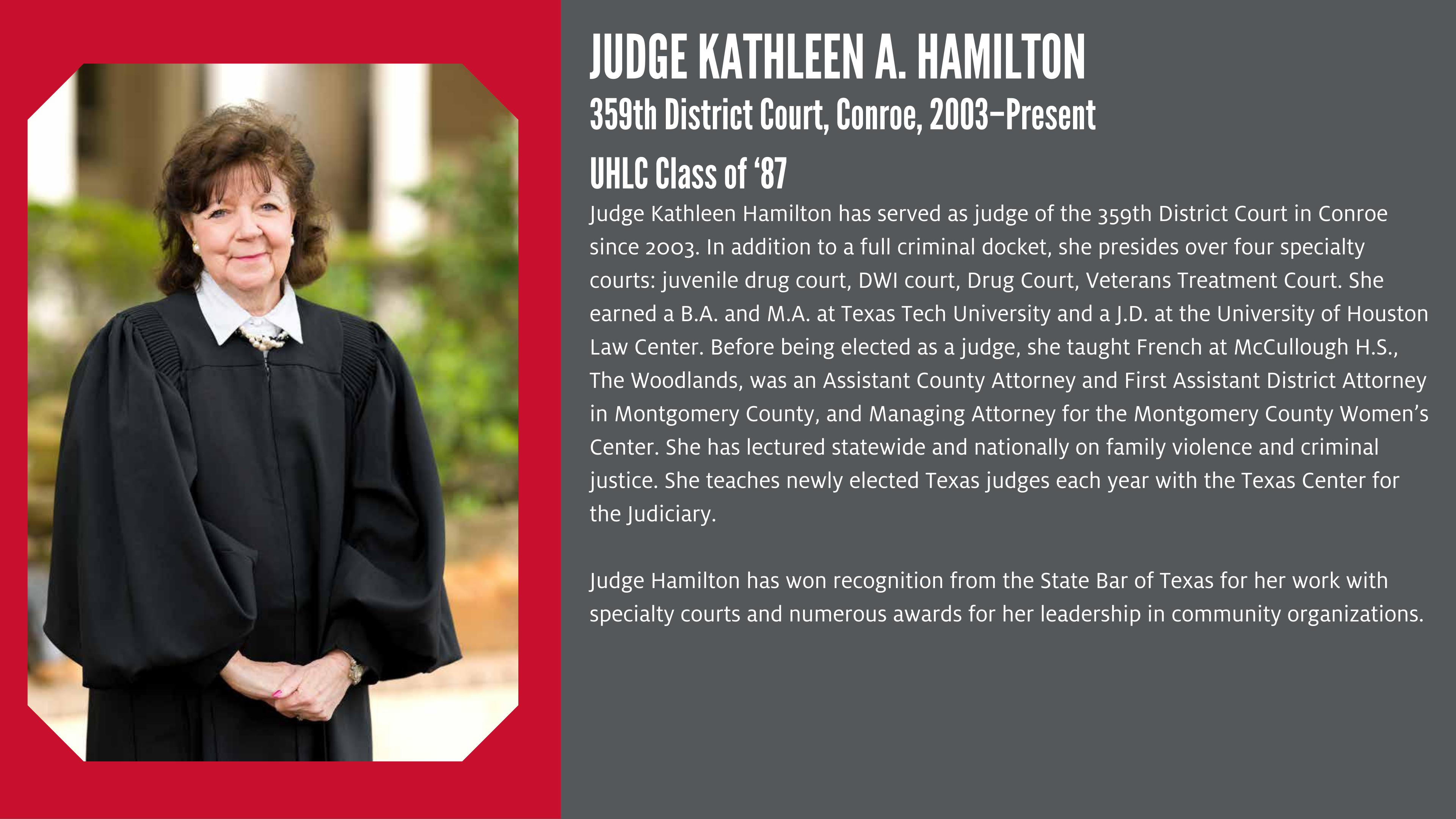 The recognition of the members of the judiciary is an ongoing project made possible by your submissions. To be included on the digital judicial wall and this site, please CLICK HERE. For questions, to update an existing slide, or to add someone you know, please contact Kristina Van Arsdel at kgvanars@central.uh.edu.