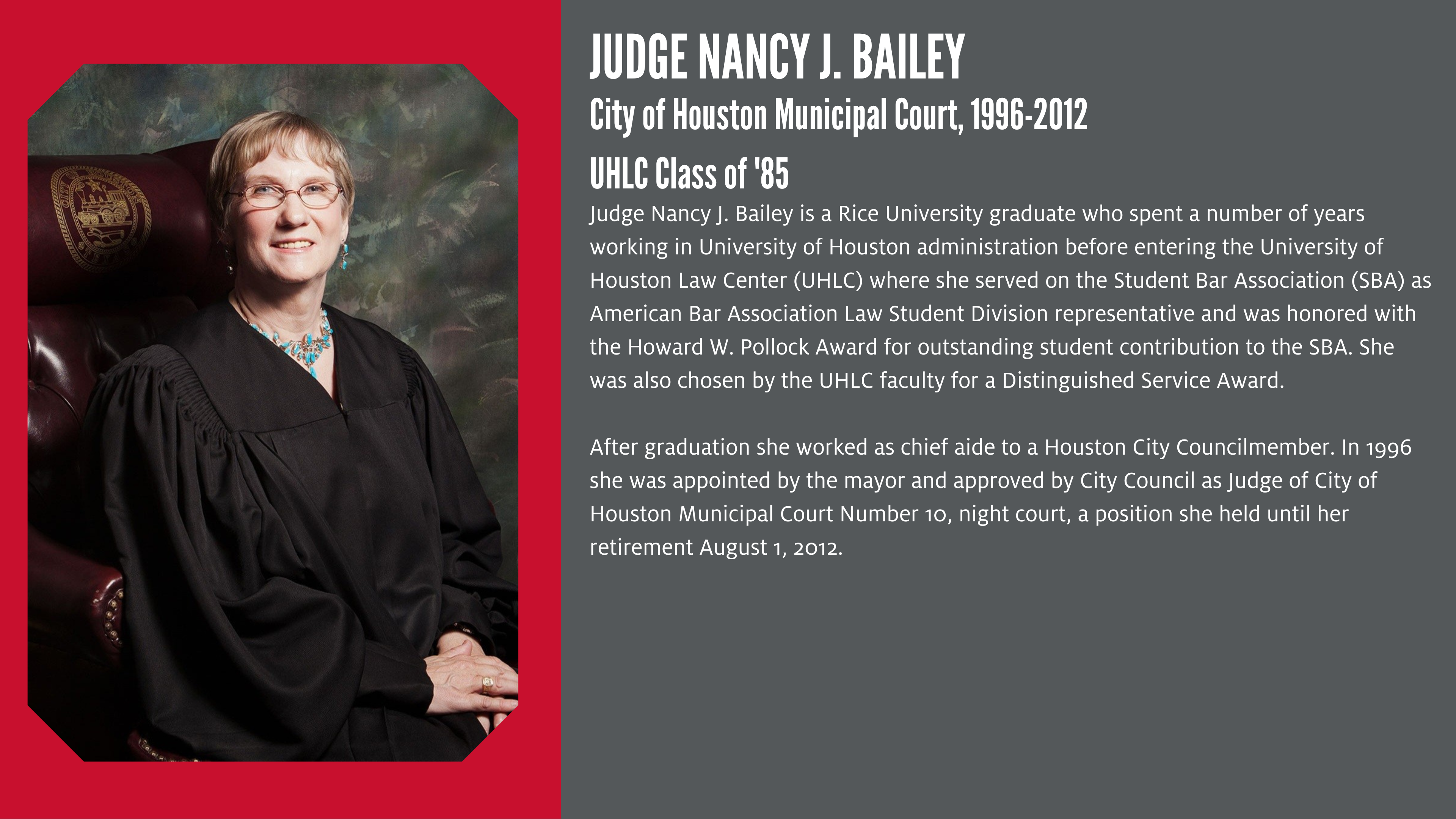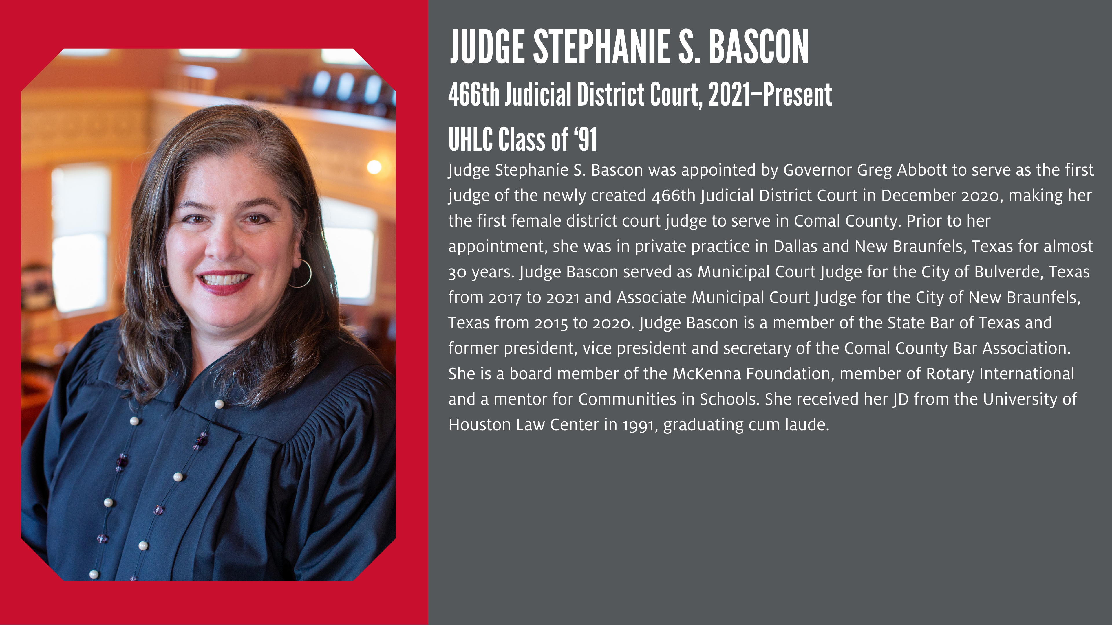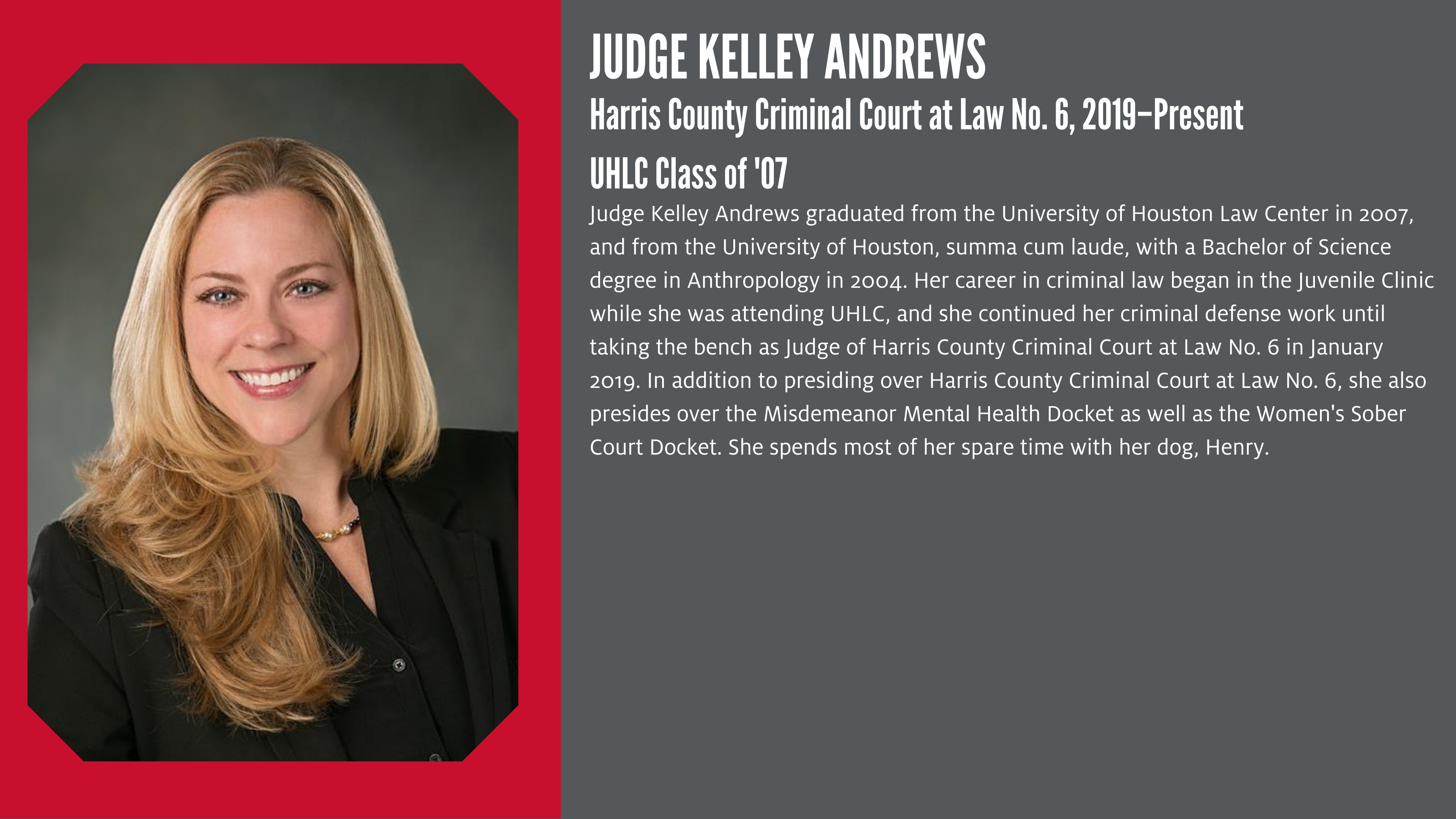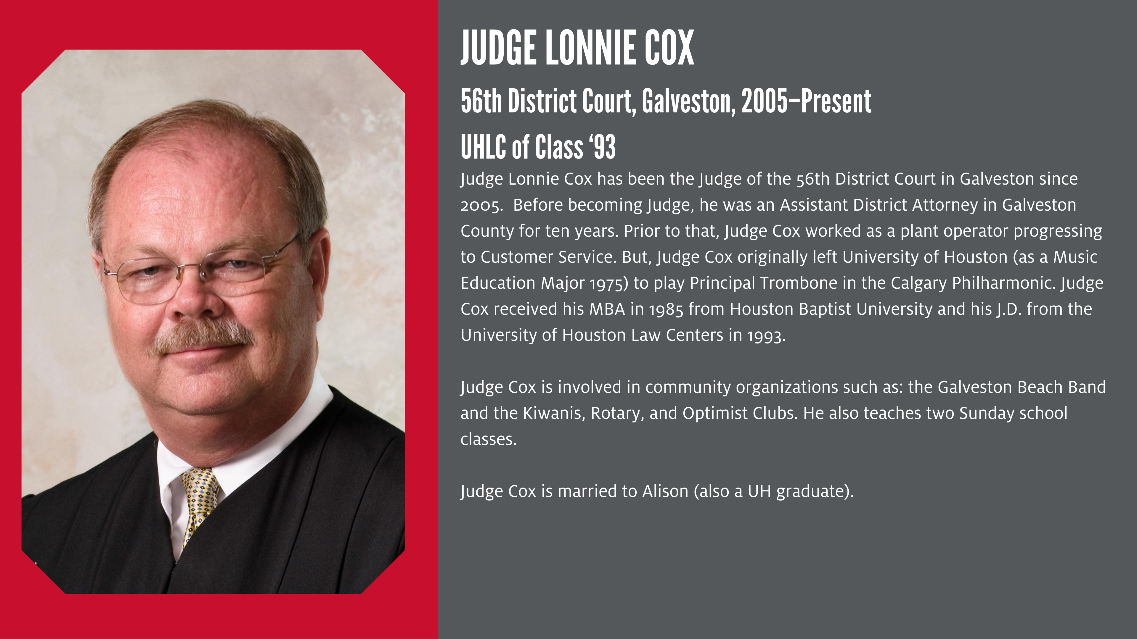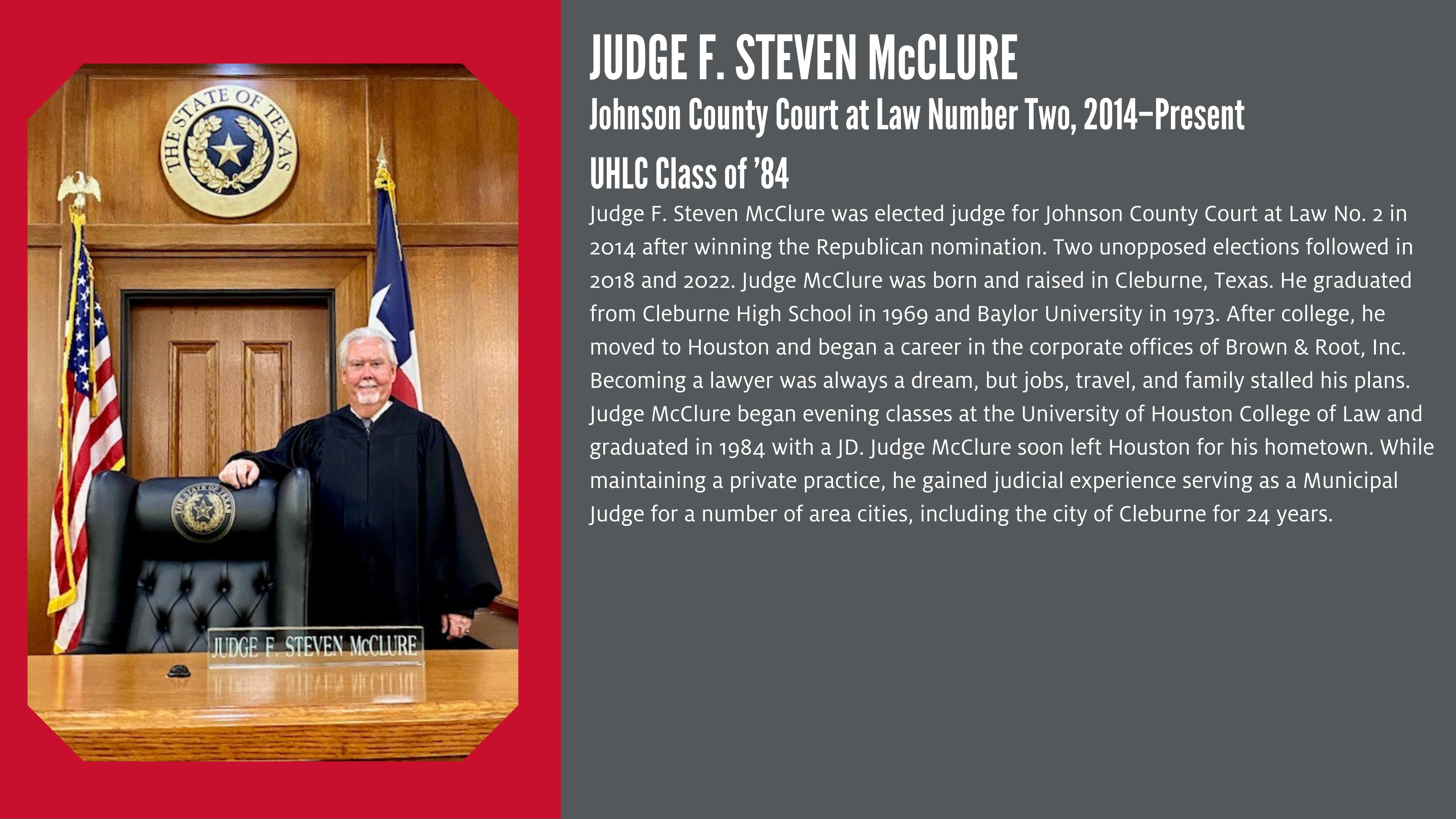 The recognition of the members of the judiciary is an ongoing project made possible by your submissions. To be included on the digital judicial wall and this site, please CLICK HERE. For questions, to update an existing slide, or to add someone you know, please contact Kristina Van Arsdel at kgvanars@central.uh.edu.