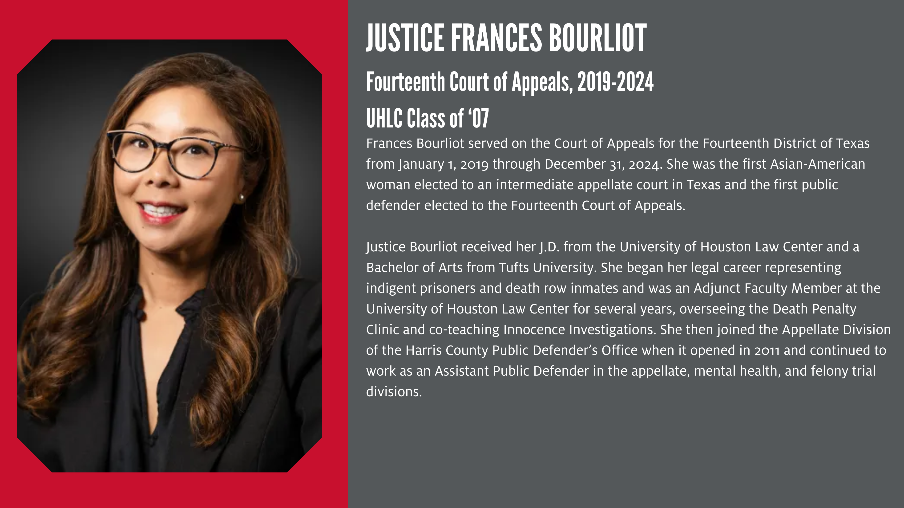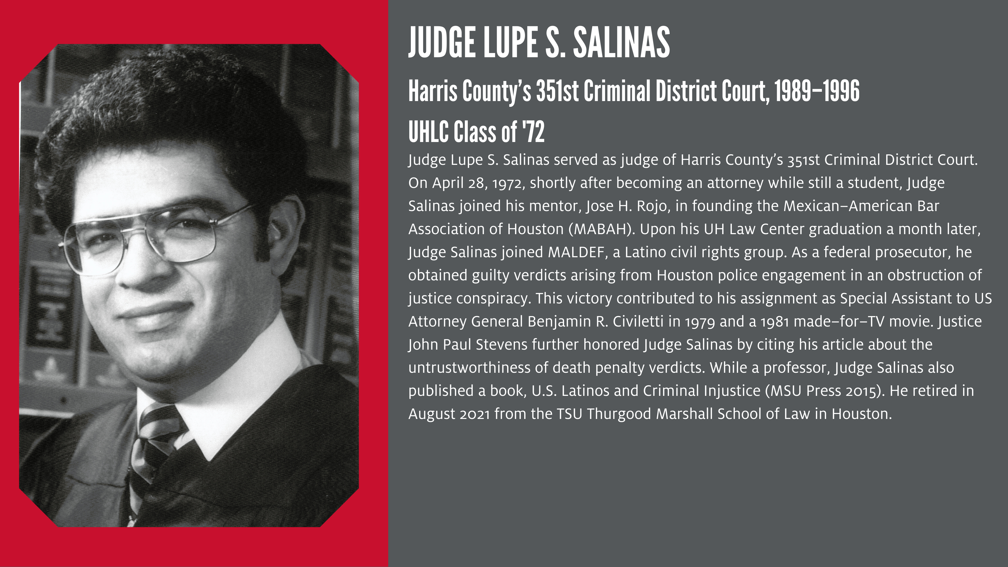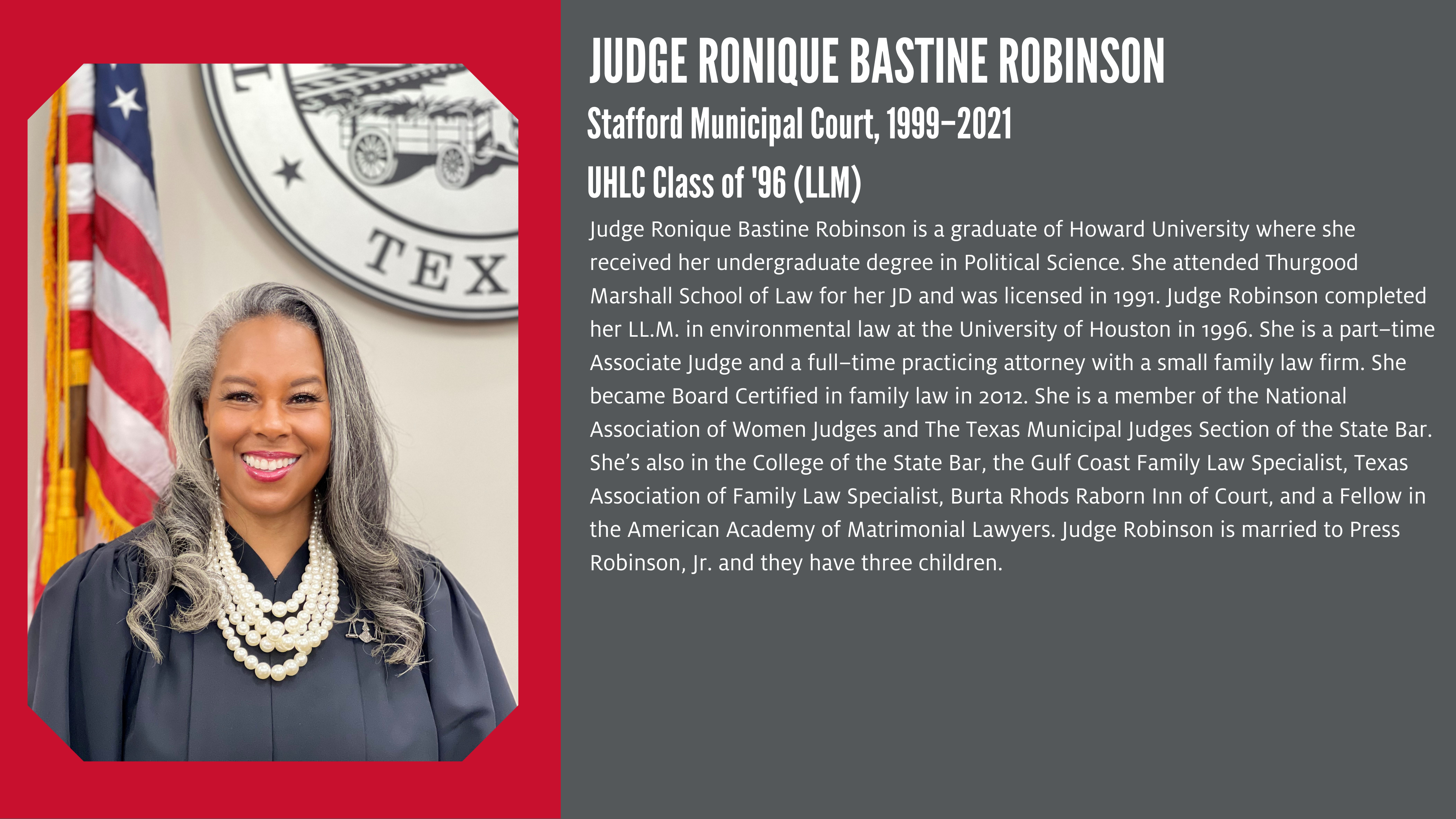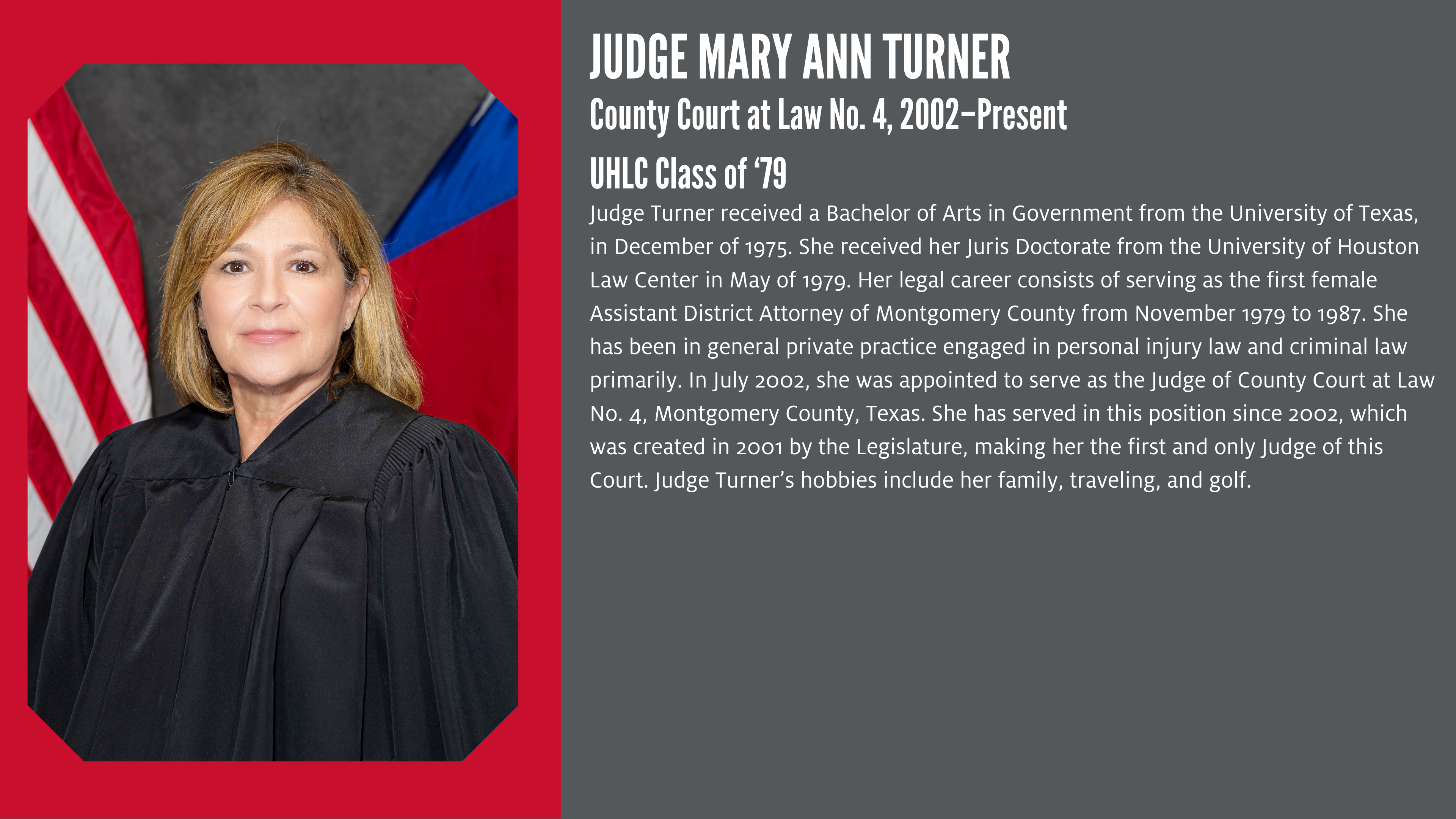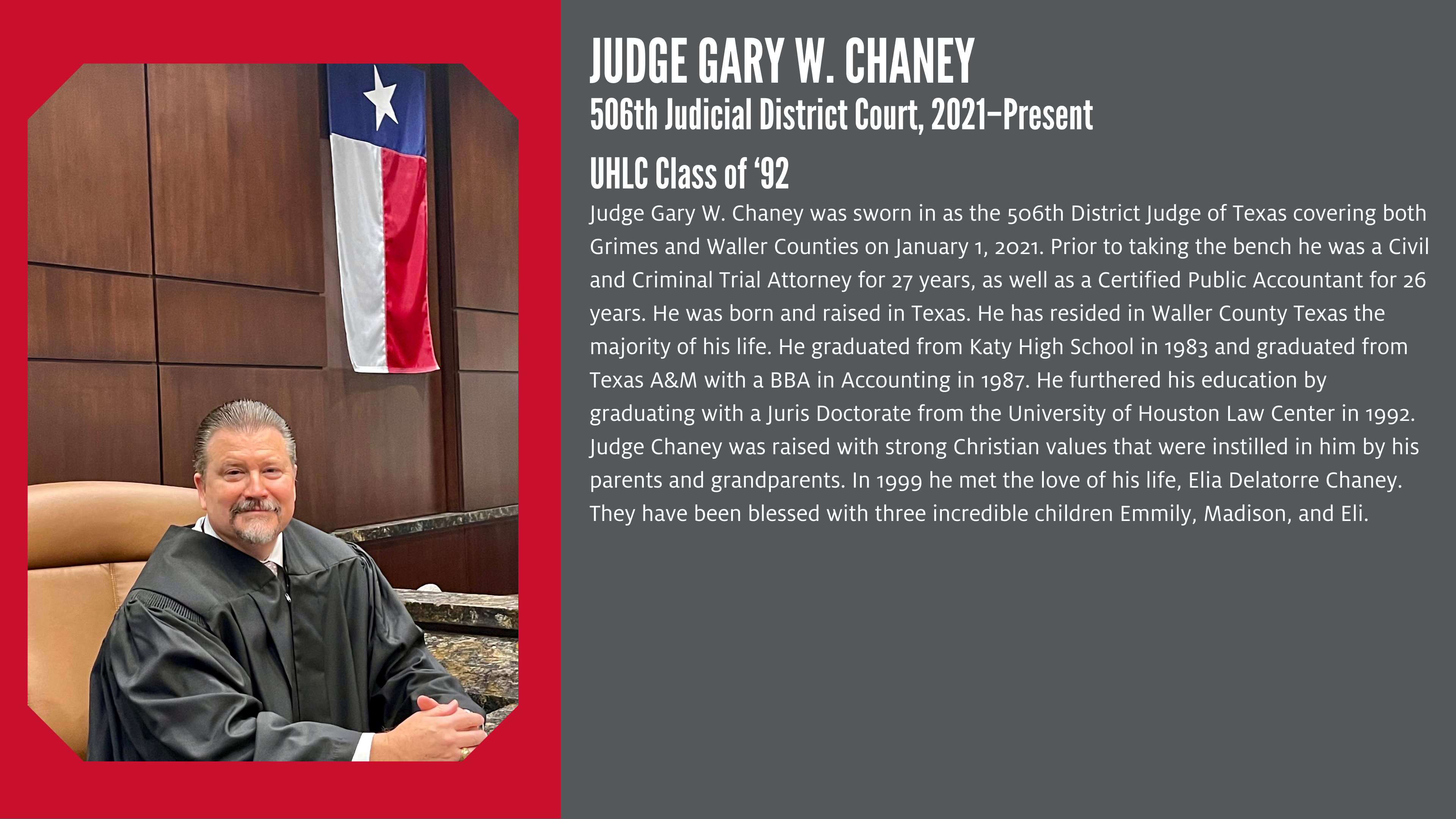 The recognition of the members of the judiciary is an ongoing project made possible by your submissions. To be included on the digital judicial wall and this site, please CLICK HERE. For questions, to update an existing slide, or to add someone you know, please contact Kristina Van Arsdel at kgvanars@central.uh.edu.