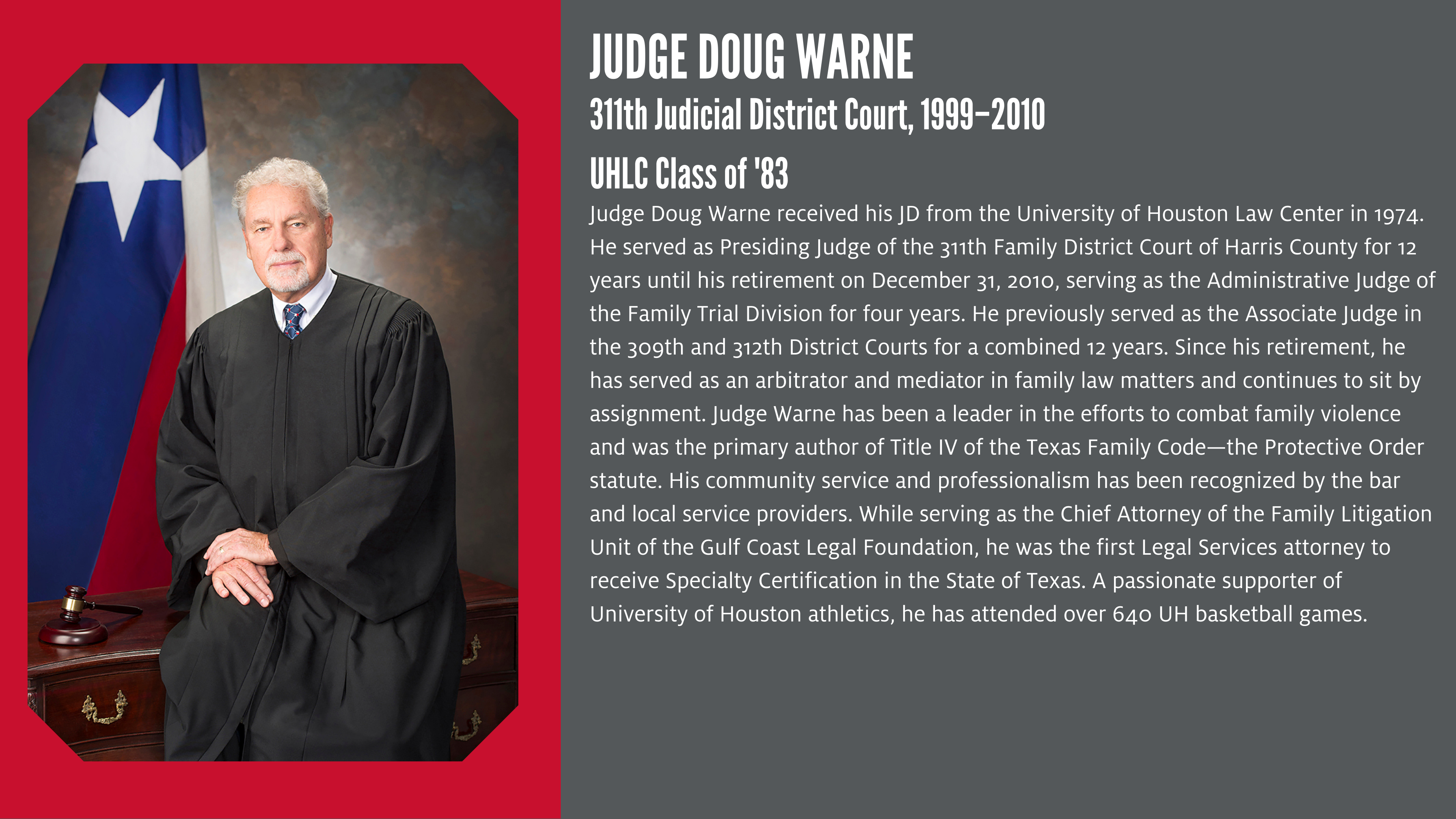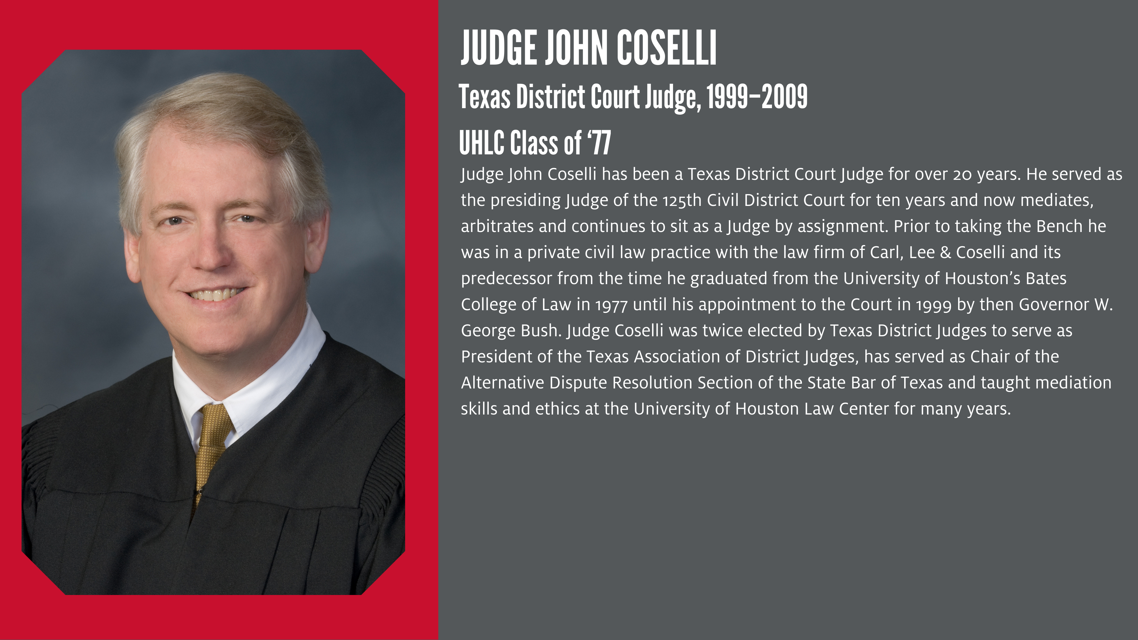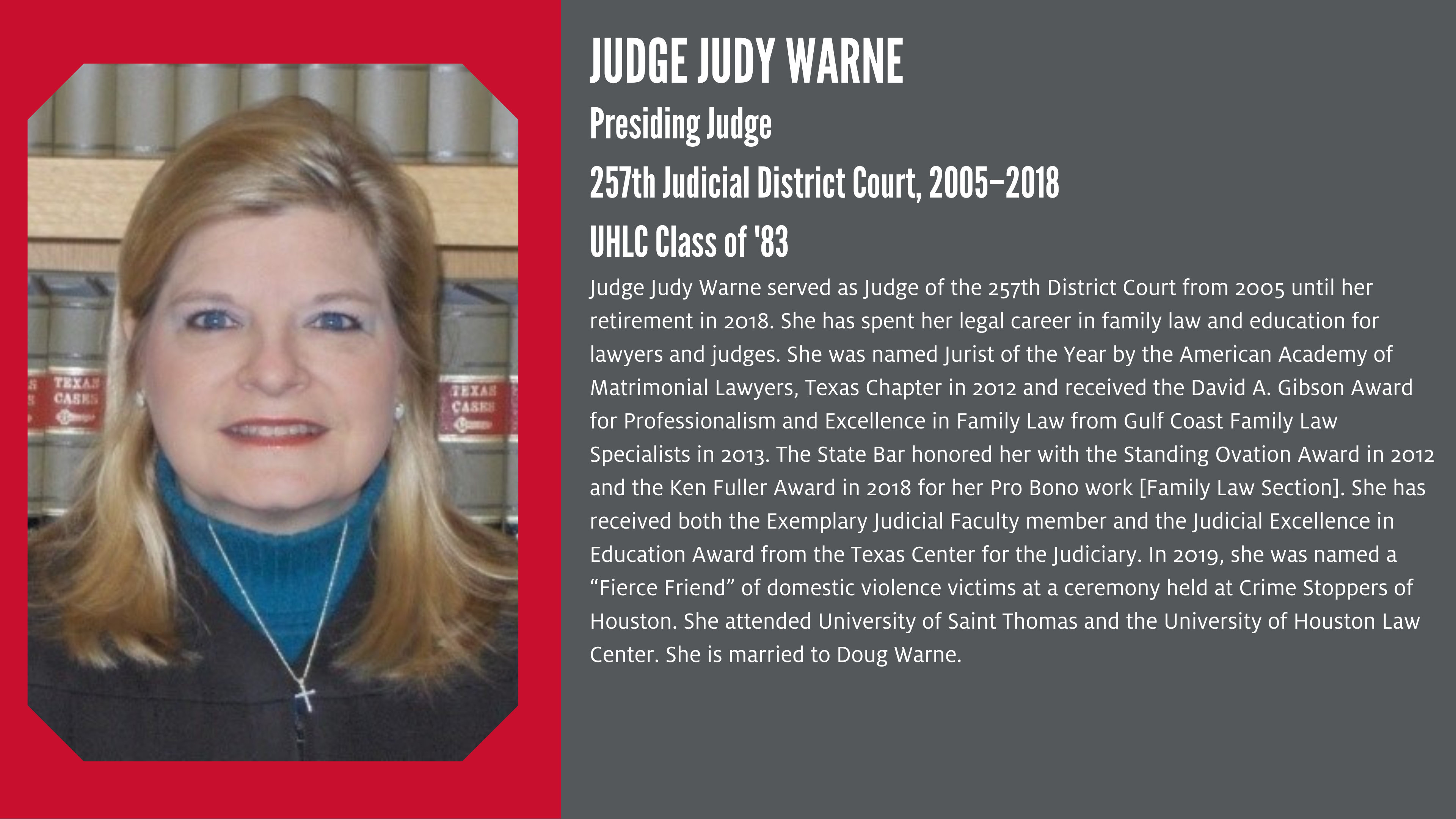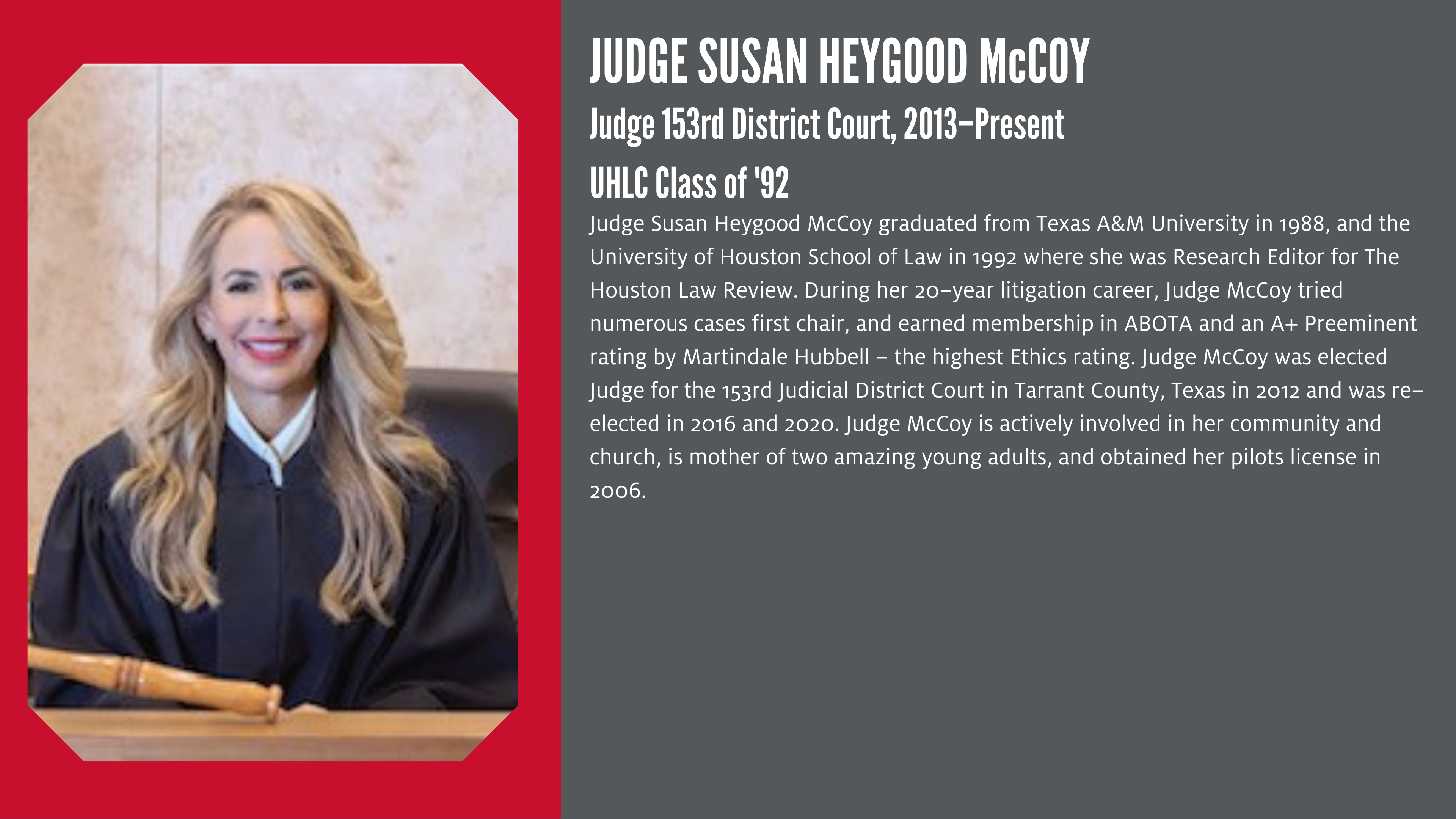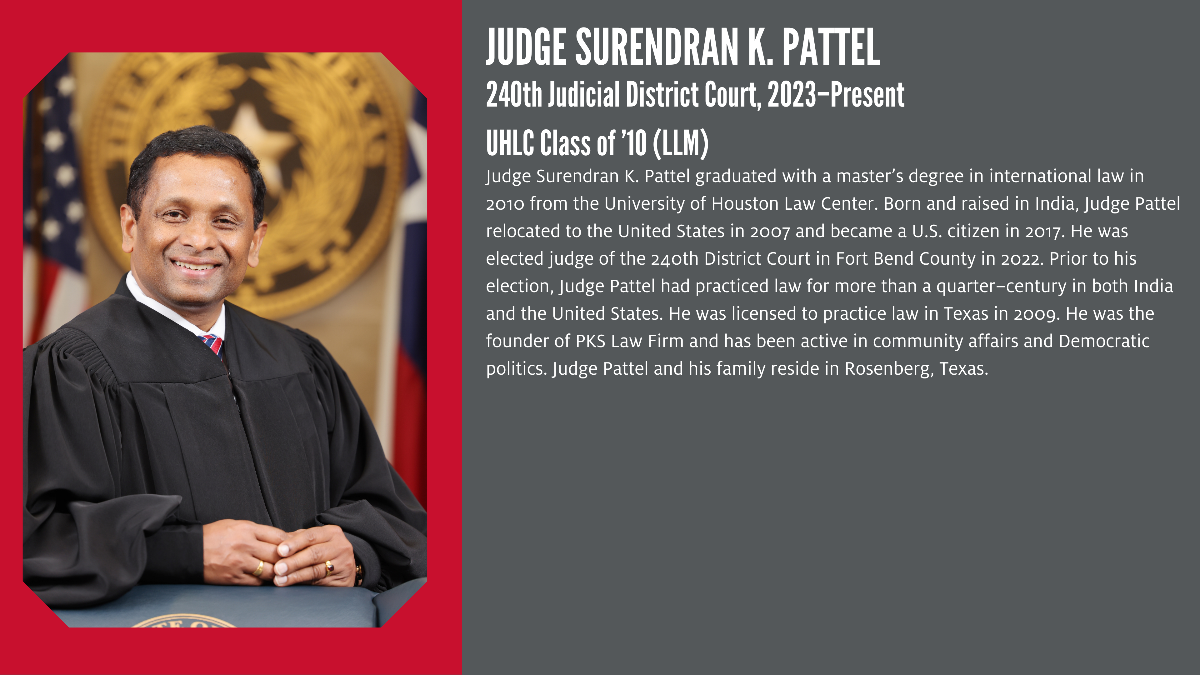 The recognition of the members of the judiciary is an ongoing project made possible by your submissions. To be included on the digital judicial wall and this site, please CLICK HERE. For questions, to update an existing slide, or to add someone you know, please contact Kristina Van Arsdel at kgvanars@central.uh.edu.