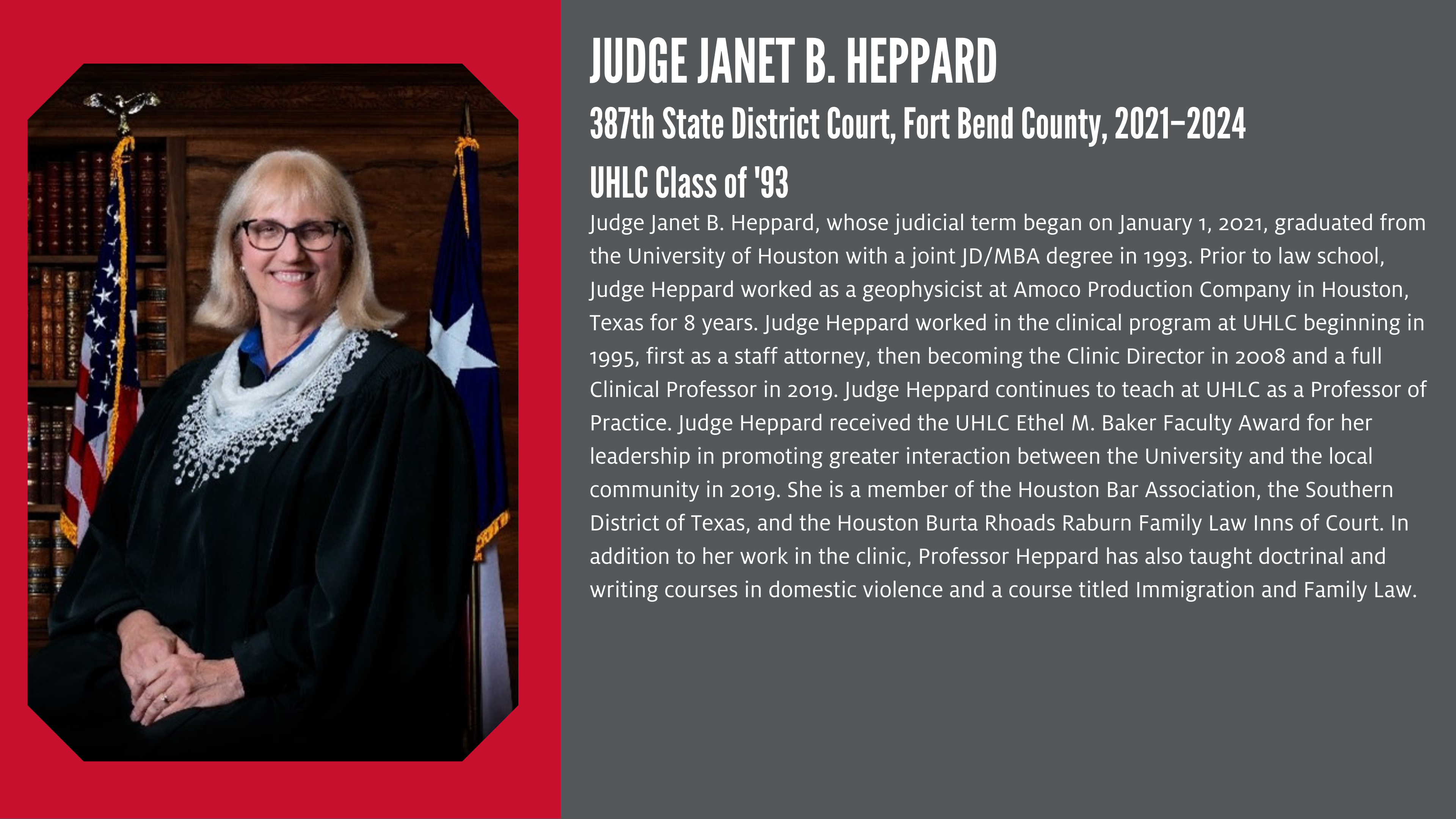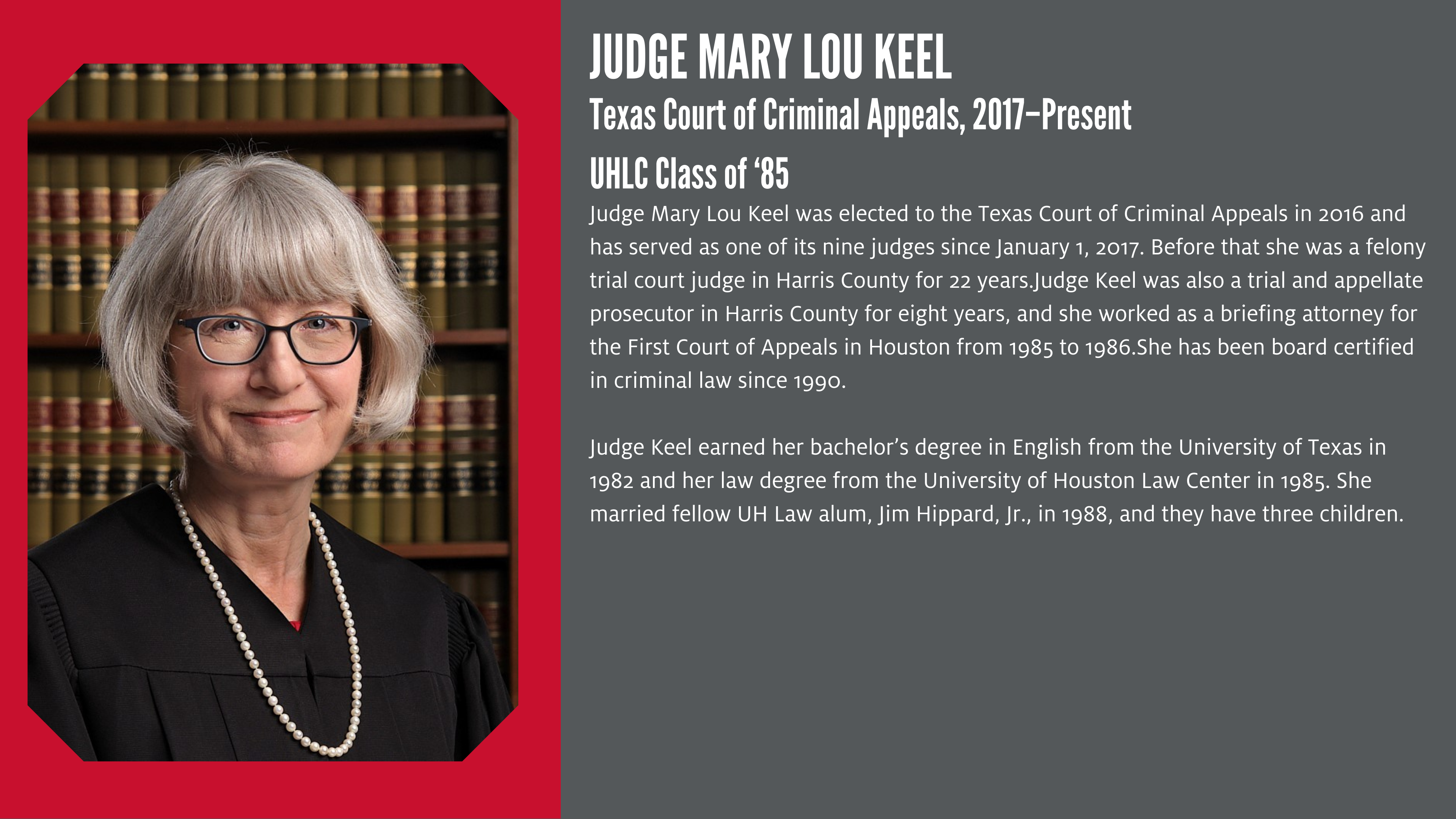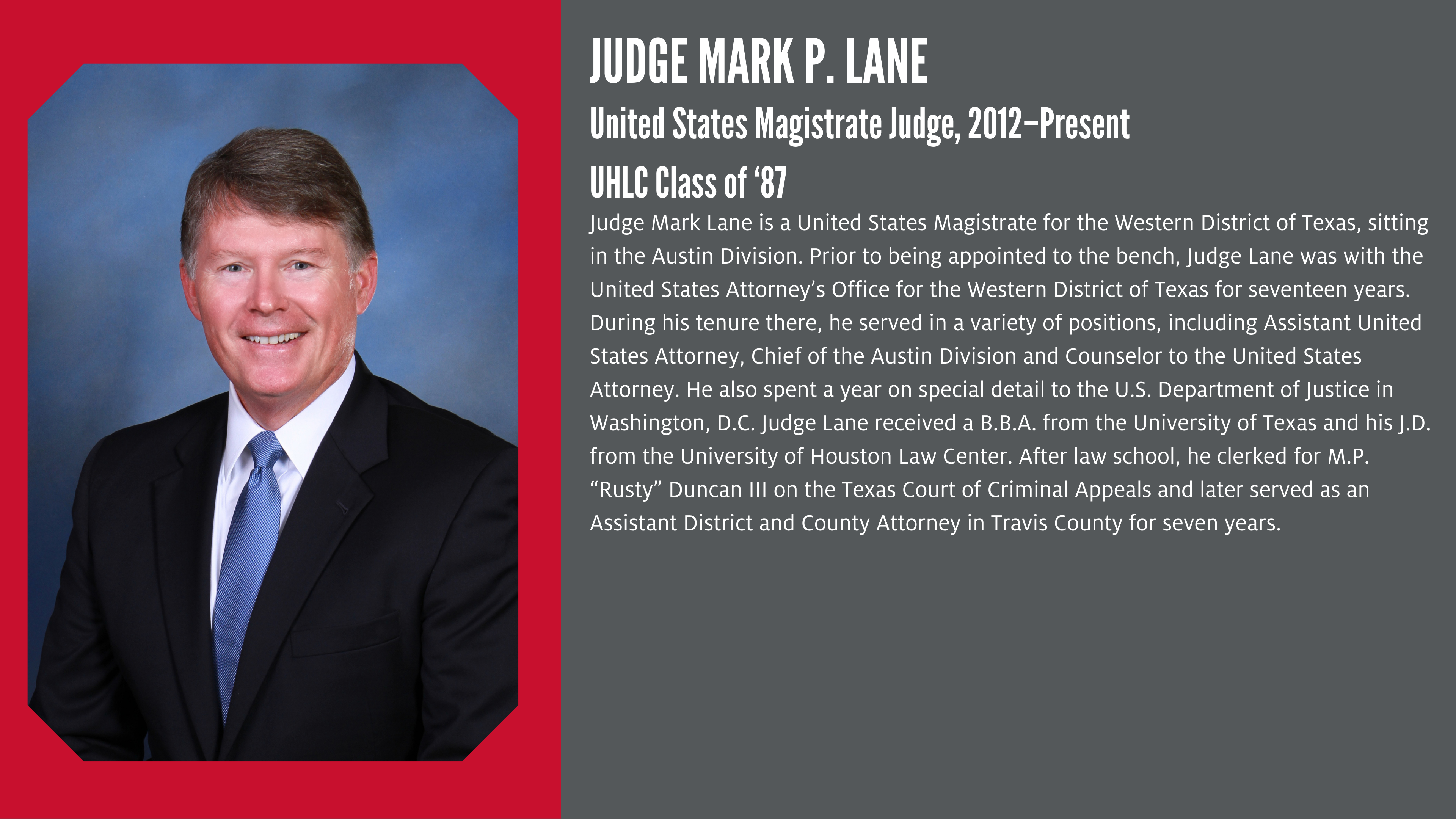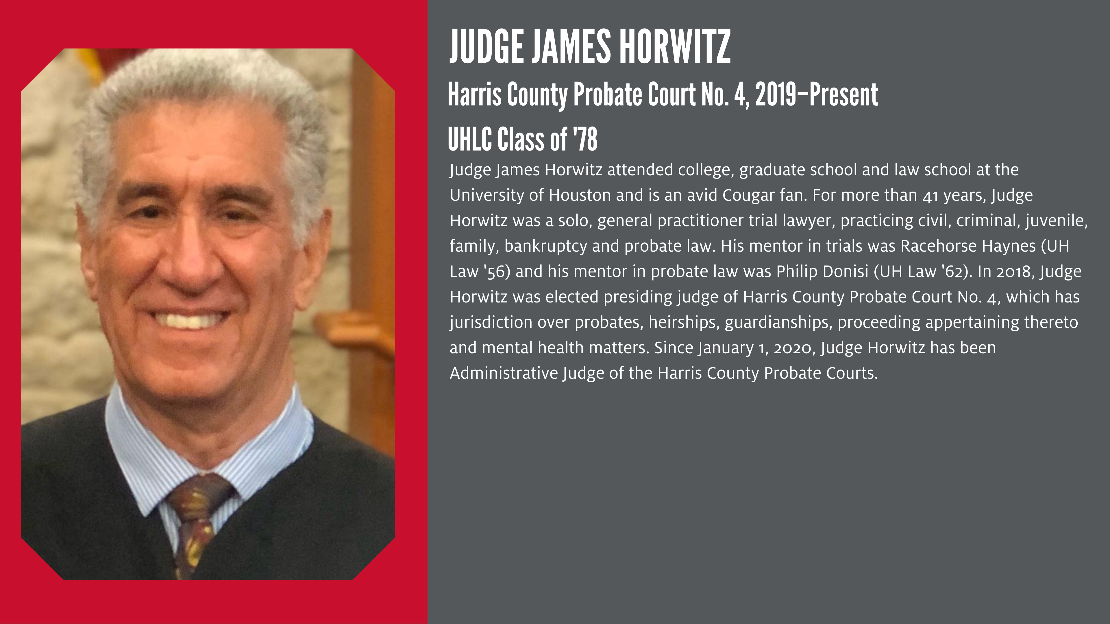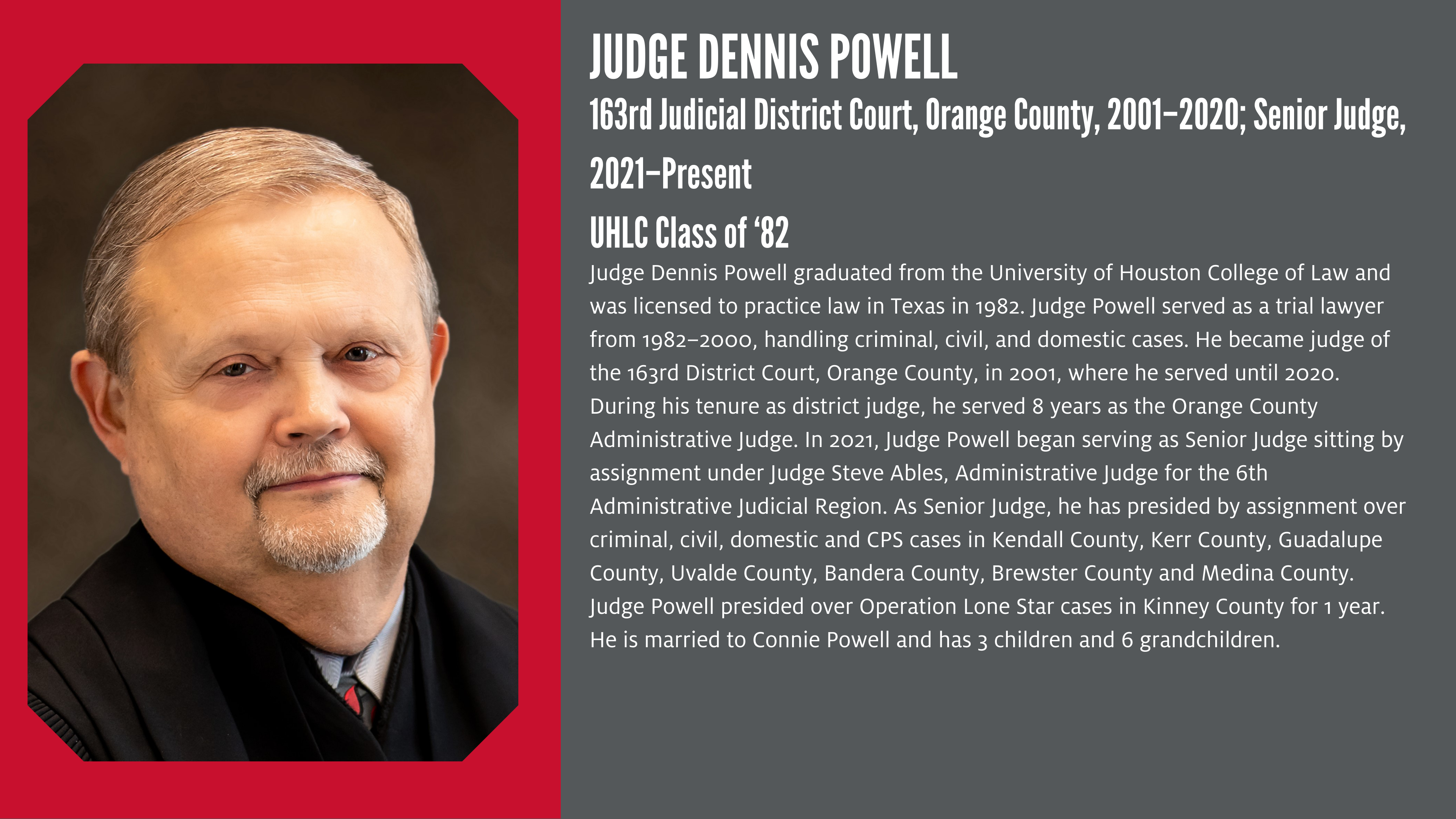 The recognition of the members of the judiciary is an ongoing project made possible by your submissions. To be included on the digital judicial wall and this site, please CLICK HERE. For questions, to update an existing slide, or to add someone you know, please contact Kristina Van Arsdel at kgvanars@central.uh.edu.