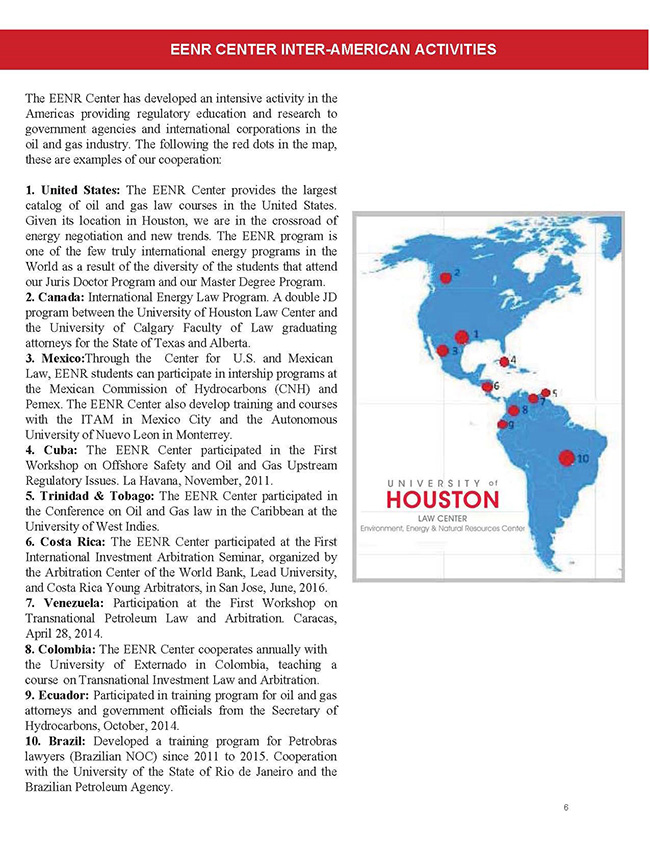 The EENR Center has developed an intensive activity in the Americas providing regulatory education and research to government agencies and international corporations in the oil and gas industry. The EENR Faculty can offer a diverse number of courses including oil and gas contracts, international petroleum transactions, shale gas and LNG regulation, oil and gas regulation in the United States, international environmental regulation, climate change, transnational arbitration in the oil and gas sector, oil and gas geopolitics and investment law.